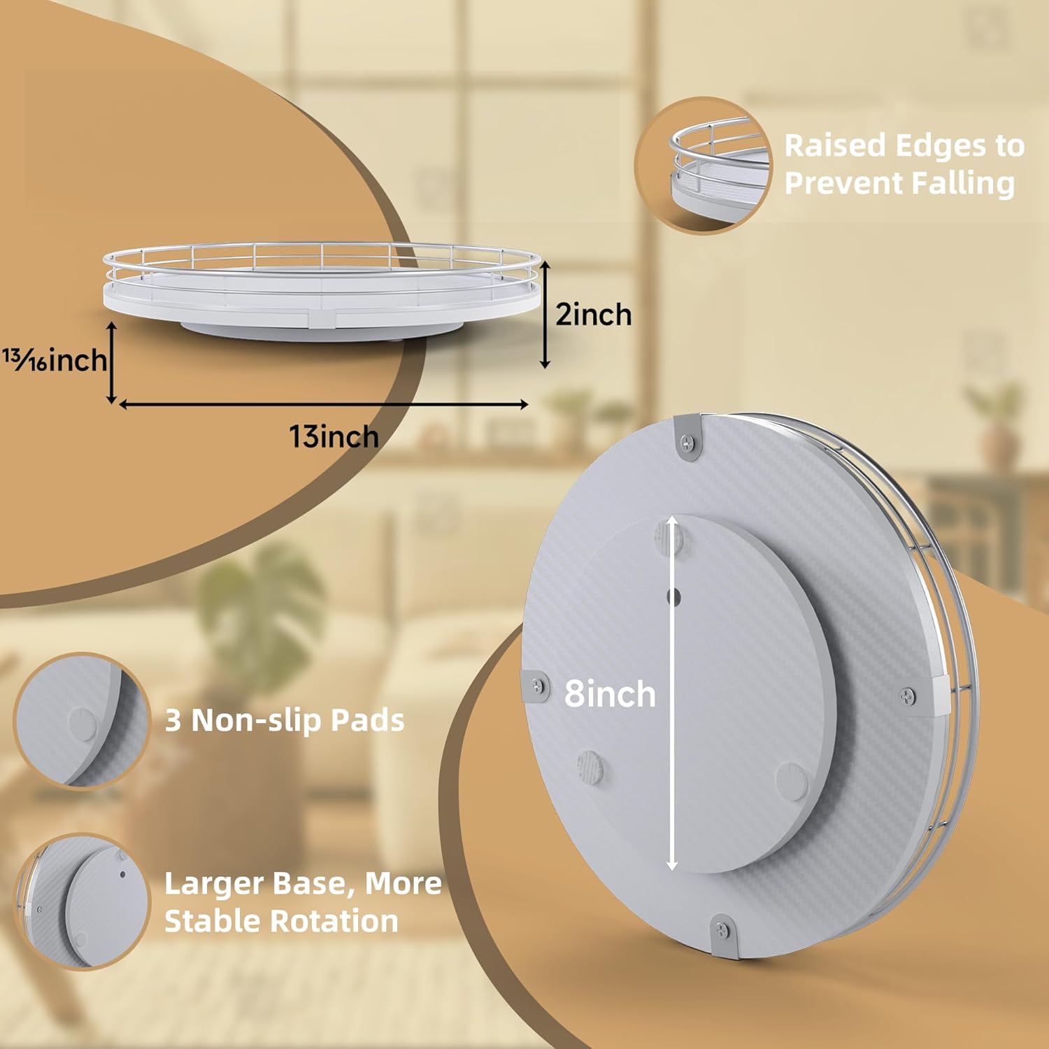 - Thoughtful Design - The raised edges are made of iron, which is sturdy and prevents items from falling off the turntable. The base is large enough and equipped with 3 anti-slip pads, the rotation is smoother and prevents scratches. No installation required, easy to use