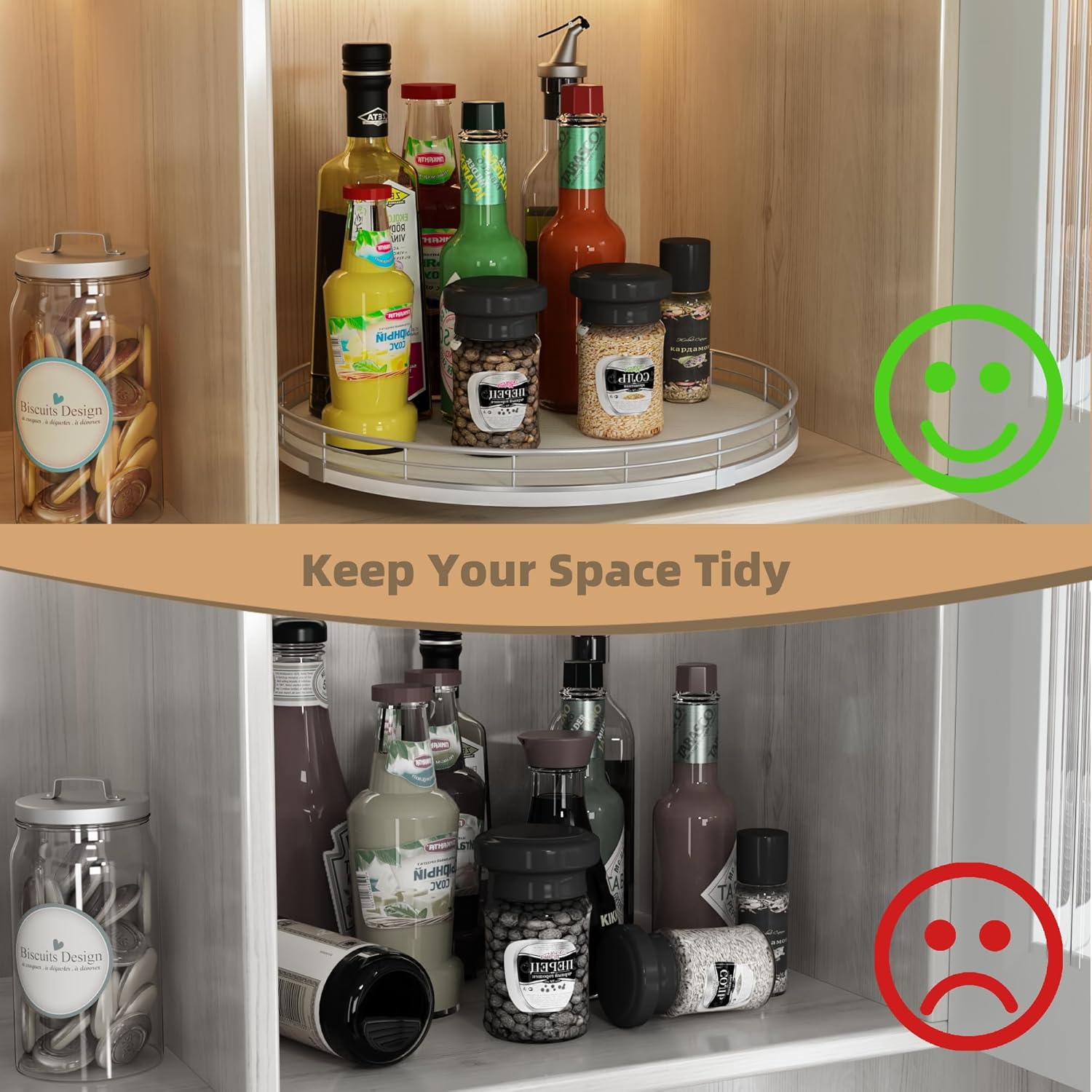 - 360°Smooth Rotation - The lazy susan turntable rotates smoothly and silently, placed next to the stove for easy access to condiments, spices, olive oil and cooking supplies. Placed next to the sink to display soap lotion. Thoughtful kitchen countertop organizers to rid your life of clutter!