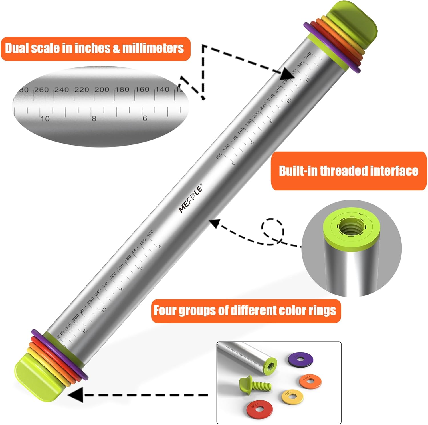 - 🍕【KITCHEN BAKING SUPPLIES】Mepple adjustable high quality stainless steel rolling pin is an essential kitchen tool. Perfect for making pizza dough, pie crusts, bread,toast and cookie doughs of uniform thickness and smoothness.A great choice for home use and gifts.