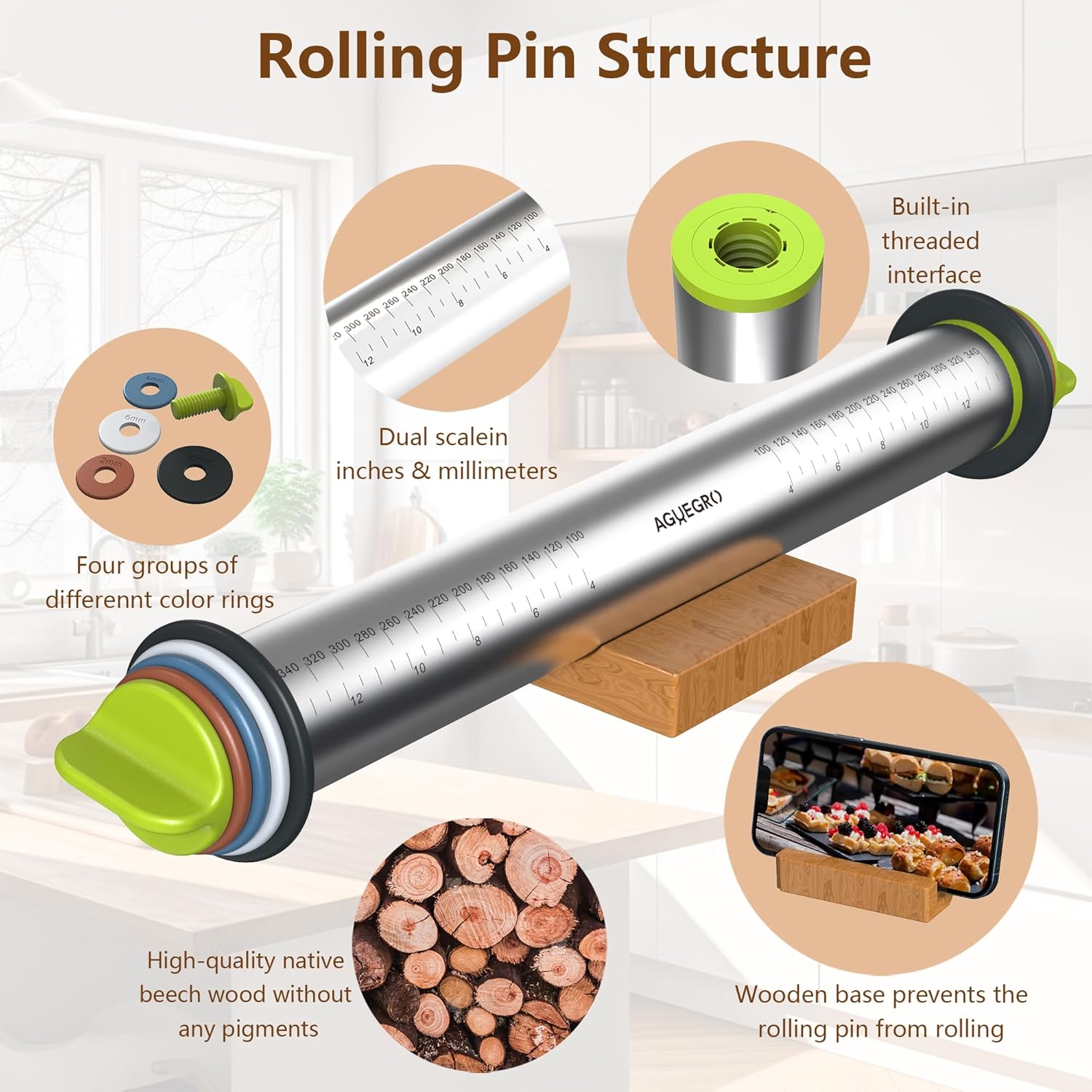 - đăBAKING SUPPLIES TOOLSă Aguegro adjustable high-quality stainless steel rolling pin is an essential kitchen tool. Perfect for making pizza dough, pie crust, bread, toast and cookie dough with consistent thickness and smoothness.It can also be preferred as the best gift.