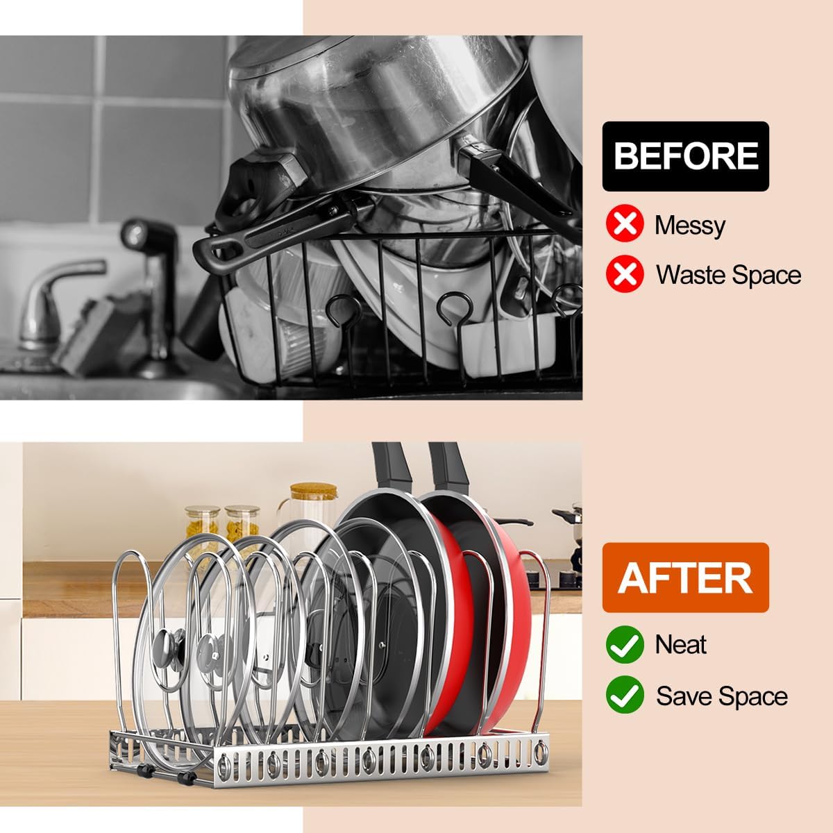 - 【Flexible to Store】 7 adjustable dividers categorize the pot and pan by adjusting the spacing freely, allowing you to easily find them without having to search around. The dividers can also keep the pan and lid upright, you can quickly see each one and get them.
