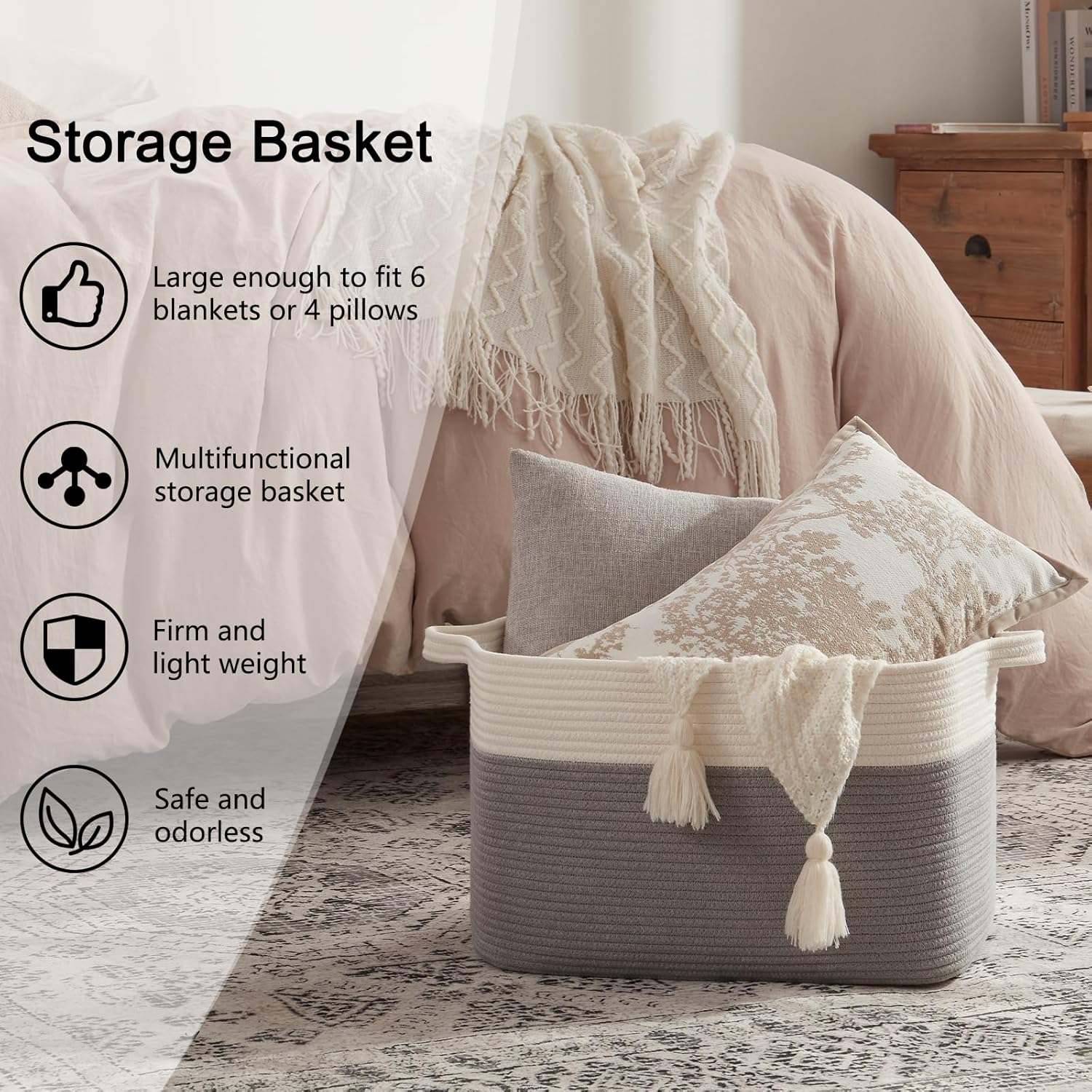 OIAHOMY 65L Blanket Basket, Cotton Rope Woven Blanket storage for Living Room, Rectangle Woven Baskets for Storage, 20''×16''×12'', Grey and White