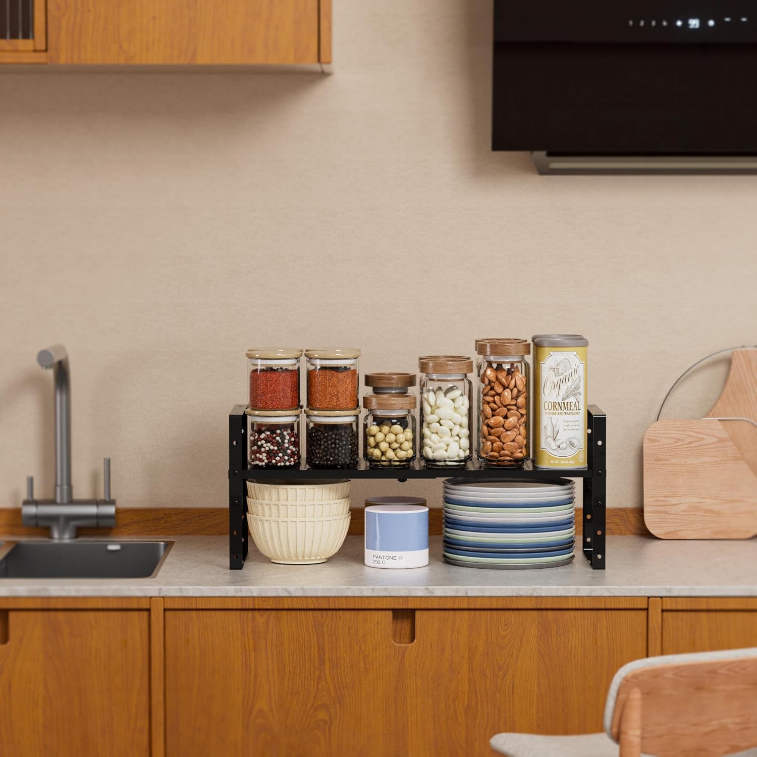 Expandable Shoe Rack Stackable Metal Pantry Storage Shelves Stand Adjustable Height Cabinet Shelf Organizer Racks Spice Shelving(1PACK/BLACK,MEDIUM)