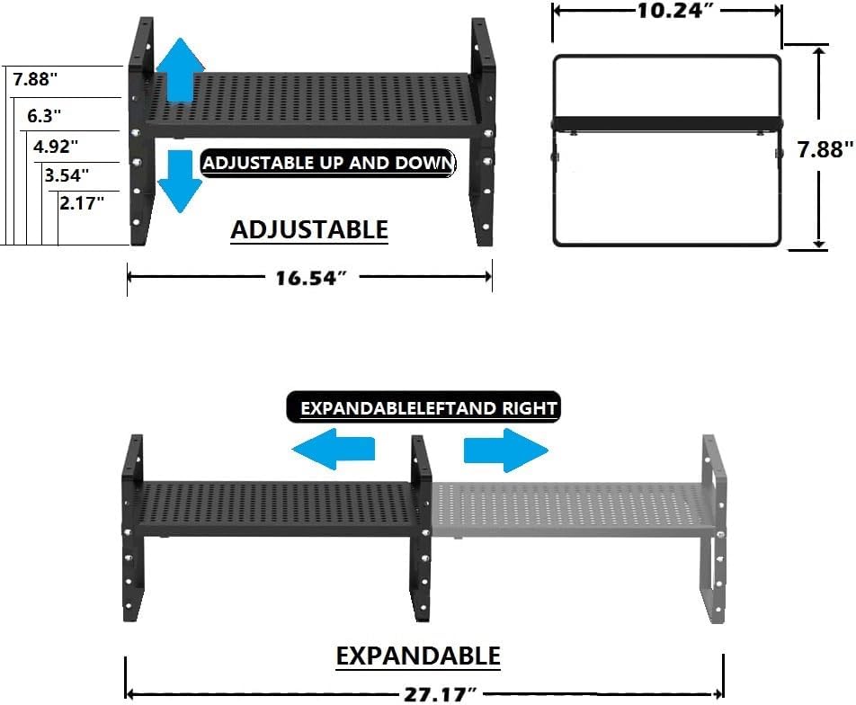 - ⭐【Expandable & Stackable Cabinet Organizer】This cabinet shelf is expandable, allowing you to adjust the width and height to suit your needs.The measures are 10.24"Dx16.54~27.17"Wx2.17~7.88"H.There are 5holes for each side which can be adjusted the width from 16.54" to 27.17".It also can be easily stacked up to a 2 or 3 tier kitchen organizer.