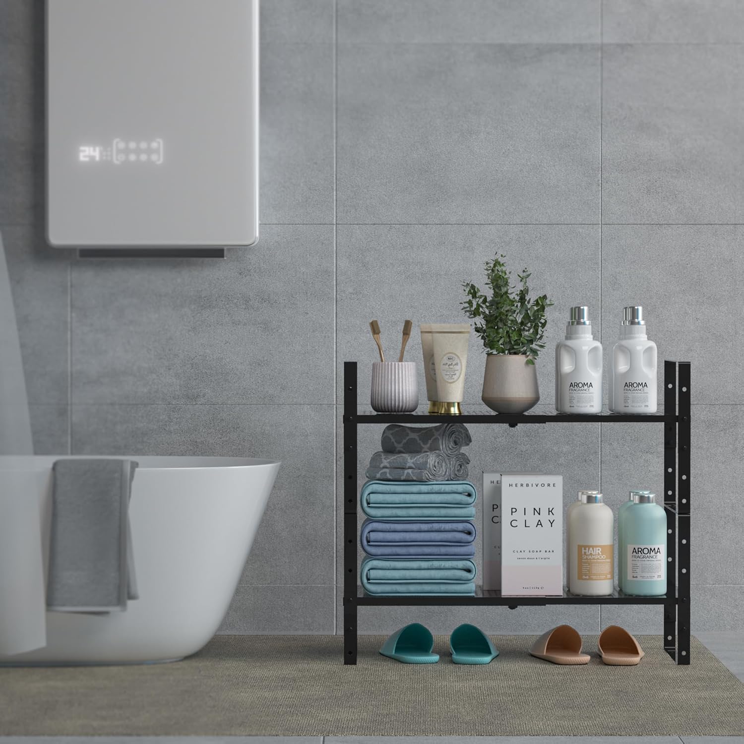 Expandable Shoe Rack Stackable Metal Pantry Storage Shelves Stand Adjustable Height Cabinet Shelf Organizer Racks Spice Shelving(2PACKS/BLACK,LARGE)