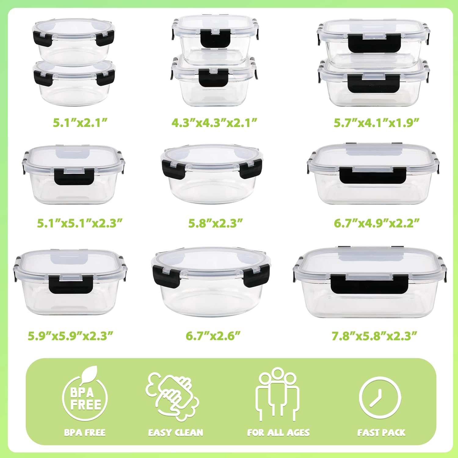 - 10 Packs Glass Food Storage Containers:With 5 packs 34oz(8”x6.5”x3”)containers and 5 packs 13oz(6”x4.5”x2.1”) containers,Great set,Two sizes, tight-fitting lids,(Note: the bottoms are glass; the lids are plastic.) use them to meal prep and keep leftovers,They are very universal from freezing to baking and the lids do not leak.