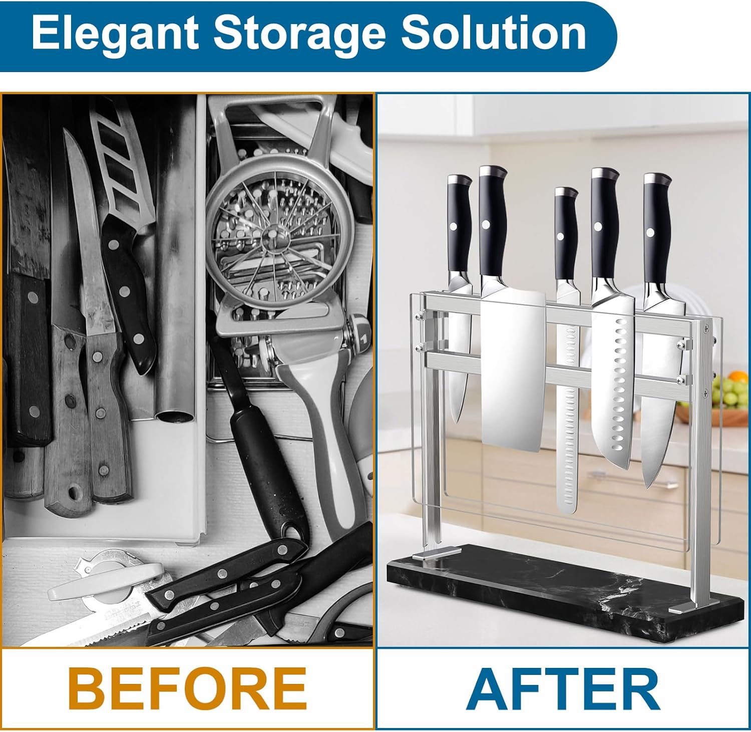- 【Simplified Cleaning Experience】Merging the sleek look of stainless steel with the timeless charm of marble, this knife holder is not just visually appealing but also incredibly easy to maintain. Its rust-resistant properties and ease of cleaning guarantee a lasting, pristine appearance with minimal effort.