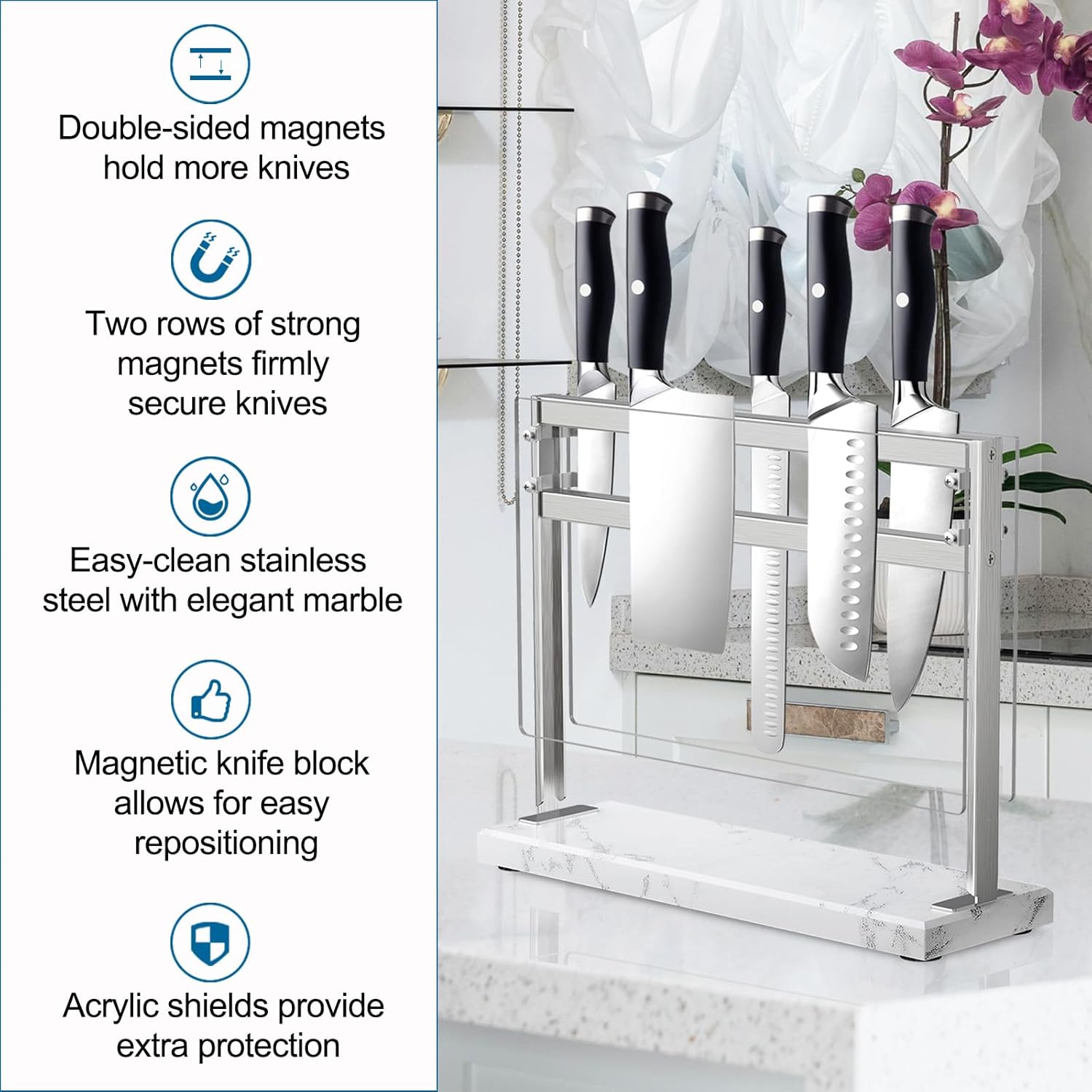YIIYIIN Magnetic Knife Block with Acrylic Shield - Marble Based Double Side Magnetic Knife Stand - Kitchen Magnetic Knife Holder - Knife Storage - Knife Holders for Counter Top - White