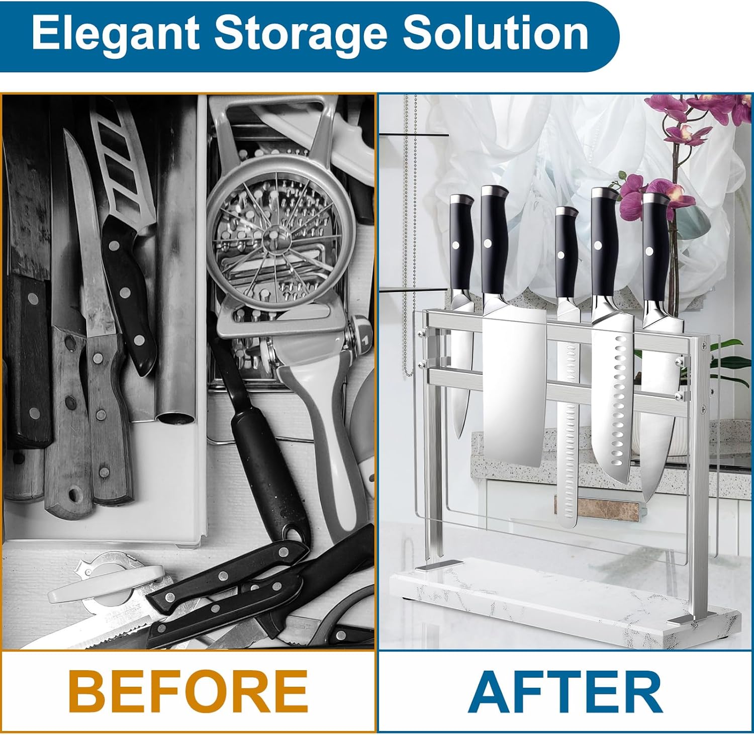 - 【Innovative Patented Design】Showcasing a fusion of high-grade 304 stainless steel, excellent marble,and premium acrylic shield. this knife holder is not only aesthetically modern and elegant but also features a unique patented design. It brings a contemporary and stylish vibe to your kitchen, setting it apart from ordinary kitchen accessories.