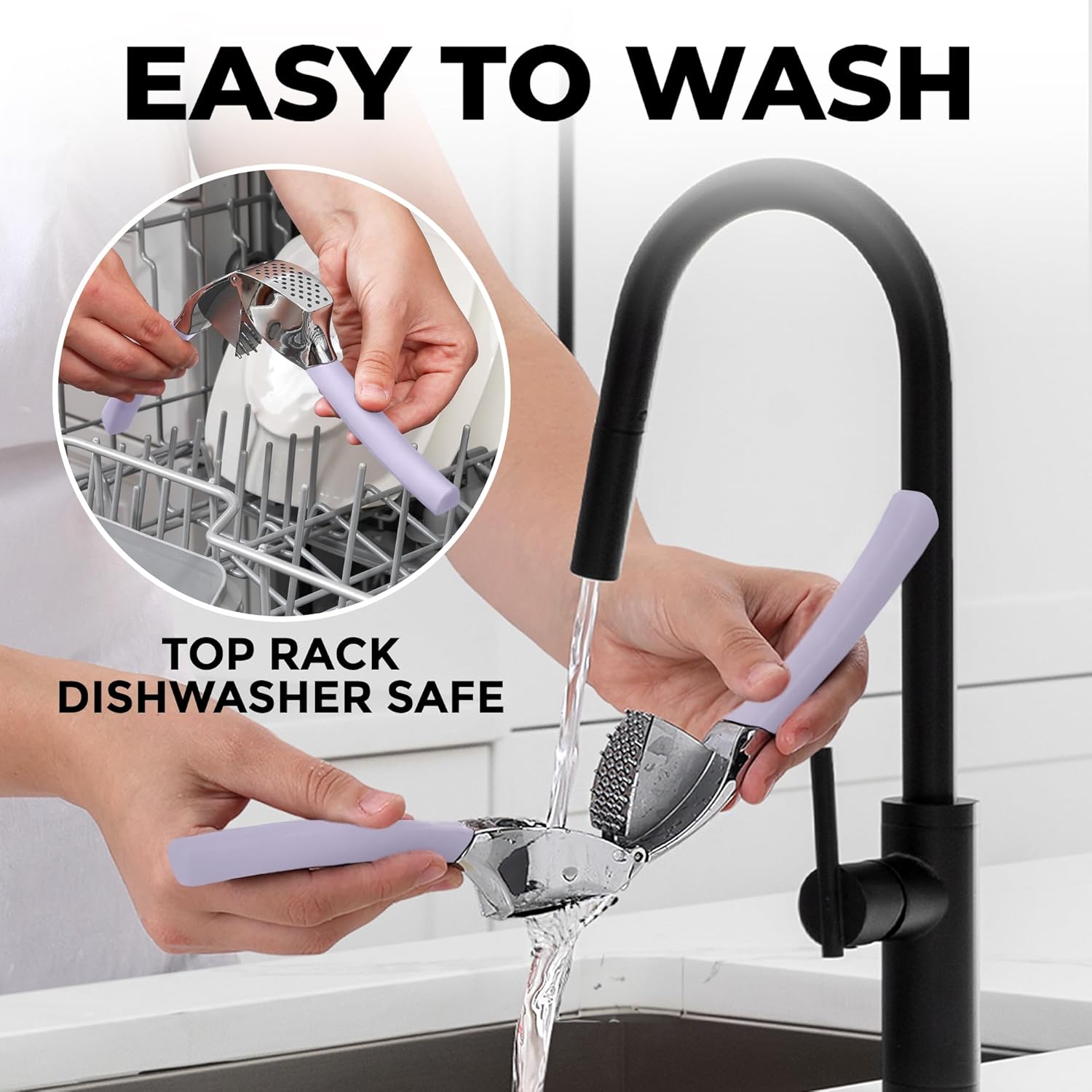 - EASY TO CLEAN: Simply rinse your garlic and ginger press tool under running water and use the included cleaning brush to get rid of any garlic bits or place it in the dishwasher for a quick clean up. Can be washed on the top rack dishwasher but hand wash is suggested. We recommend rinsing the garlic crusher right after use to avoid residual pulp and fibers hardening up.