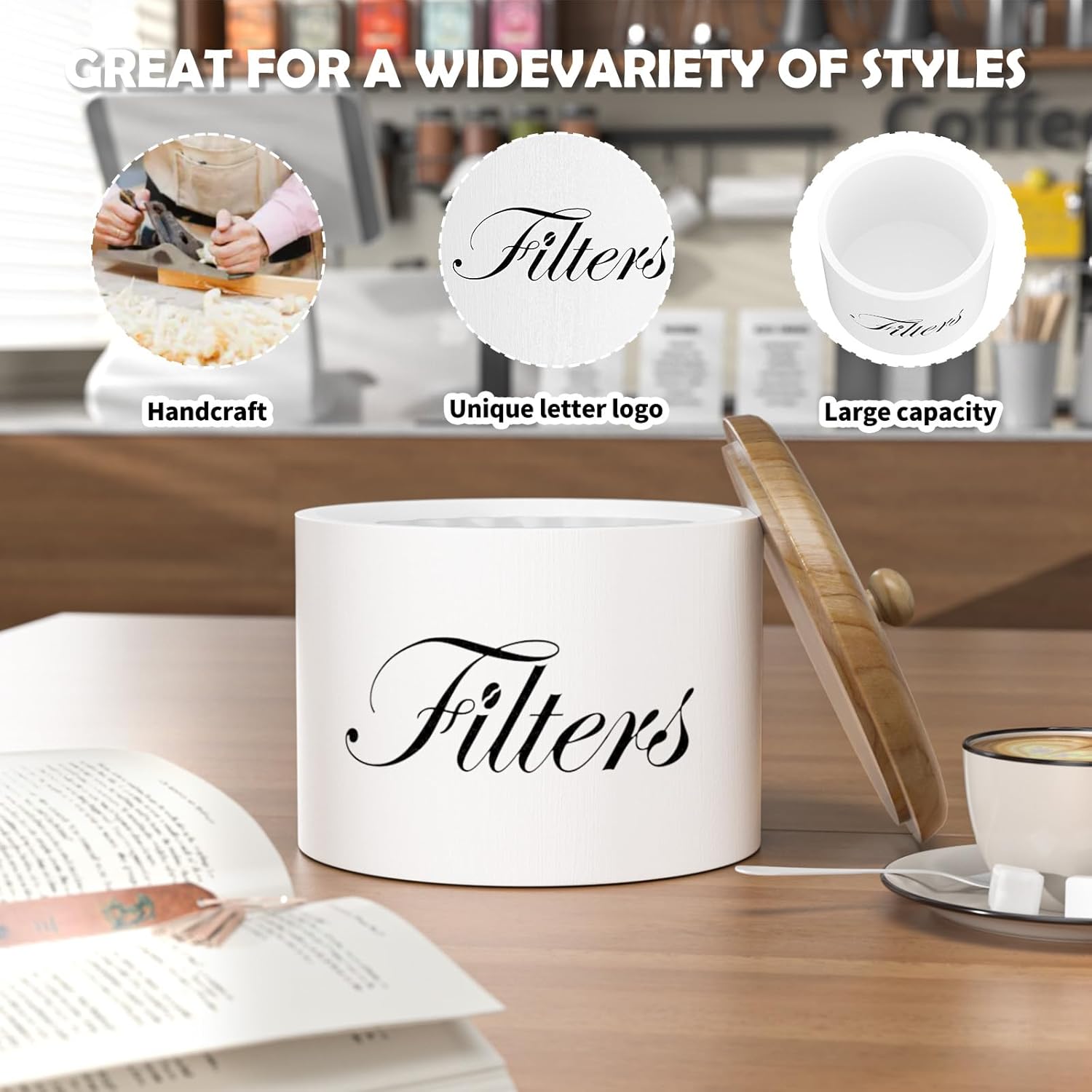 Coffee Filter Holder, Wooden Coffee Filter Storage with Lid, Round Coffee Filter Container for Counter, Rustic Farmhouse Coffee Bar Accessories Decor (White)