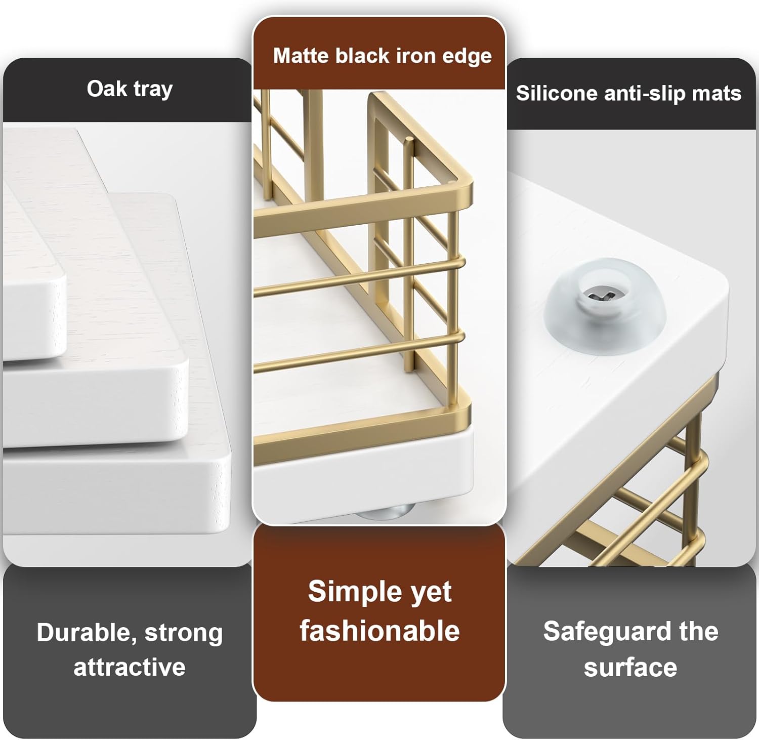 - Cost-effective: No assembly required, easy to clean. The tray crafted from iron and oak is simple and attractive. The solid bottom ensures items won't fall. With silicone non-slip pads, it provides both anti-slip functionality and better protection for surfaces