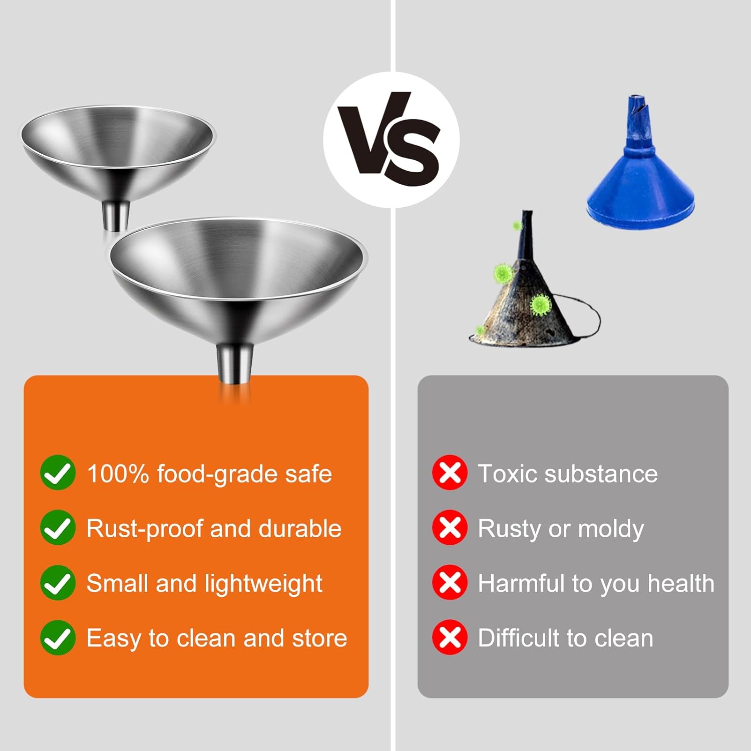 - SMALL STAINLESS STEEL FUNNELS: These stainless steel funnels are made of food grade stainless steel 304, which is non-toxic and sturdy. The high quality material gives these funnels a long service life and prevents breakage, bending, scratching and rusting.
