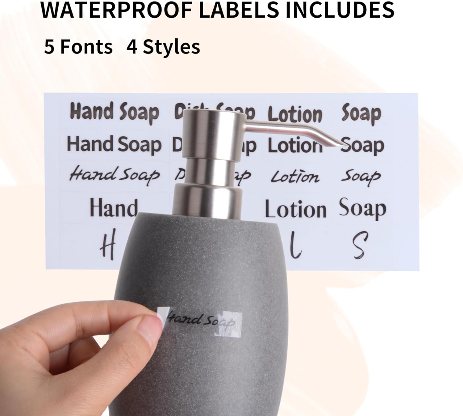- 【20PC WATERPROOF LABELS INCLUDED】Our refillable hand soap dispenser includes 20 waterproof label stickers, featuring 4 styles and 5 fonts for each style. The labels are designed for Hand Soap, Dish Soap, Lotion, and Soap, allowing you to easily identify the contents at a glance. These high-quality labels stay securely attached to the bottle without warping from moisture.