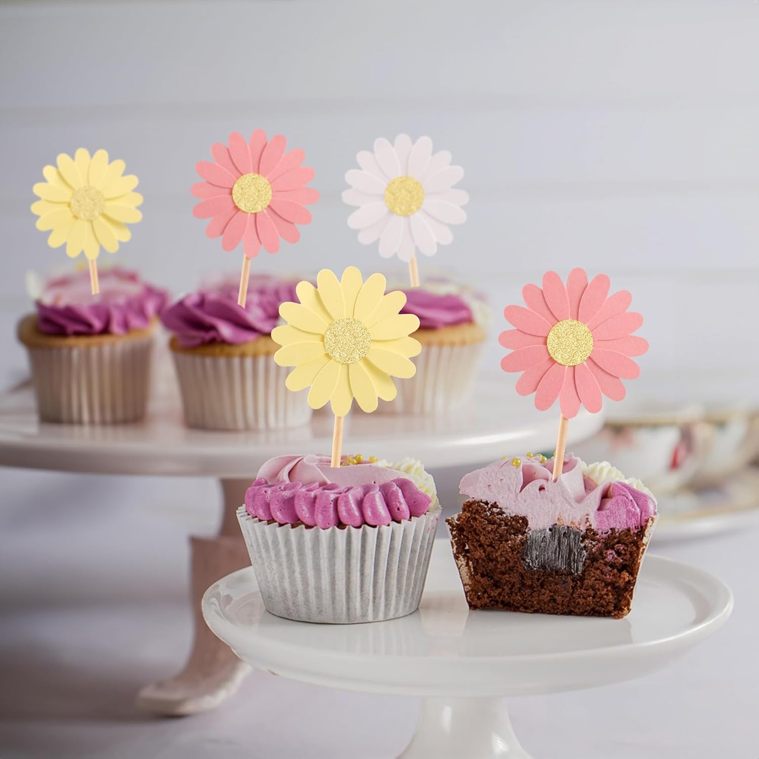 - 【NO Required】: 24Pcs Daisy Flower Cupcake Toppers can put in the cake directly! These Daisy Flower Cupcake Toppers saves your time and super easy to use. You can easily dress up your birthday theme cakes, yes! but don't stop there, put them into desserts, cookies, fruit pieces, appetizers, muffins and so much more!