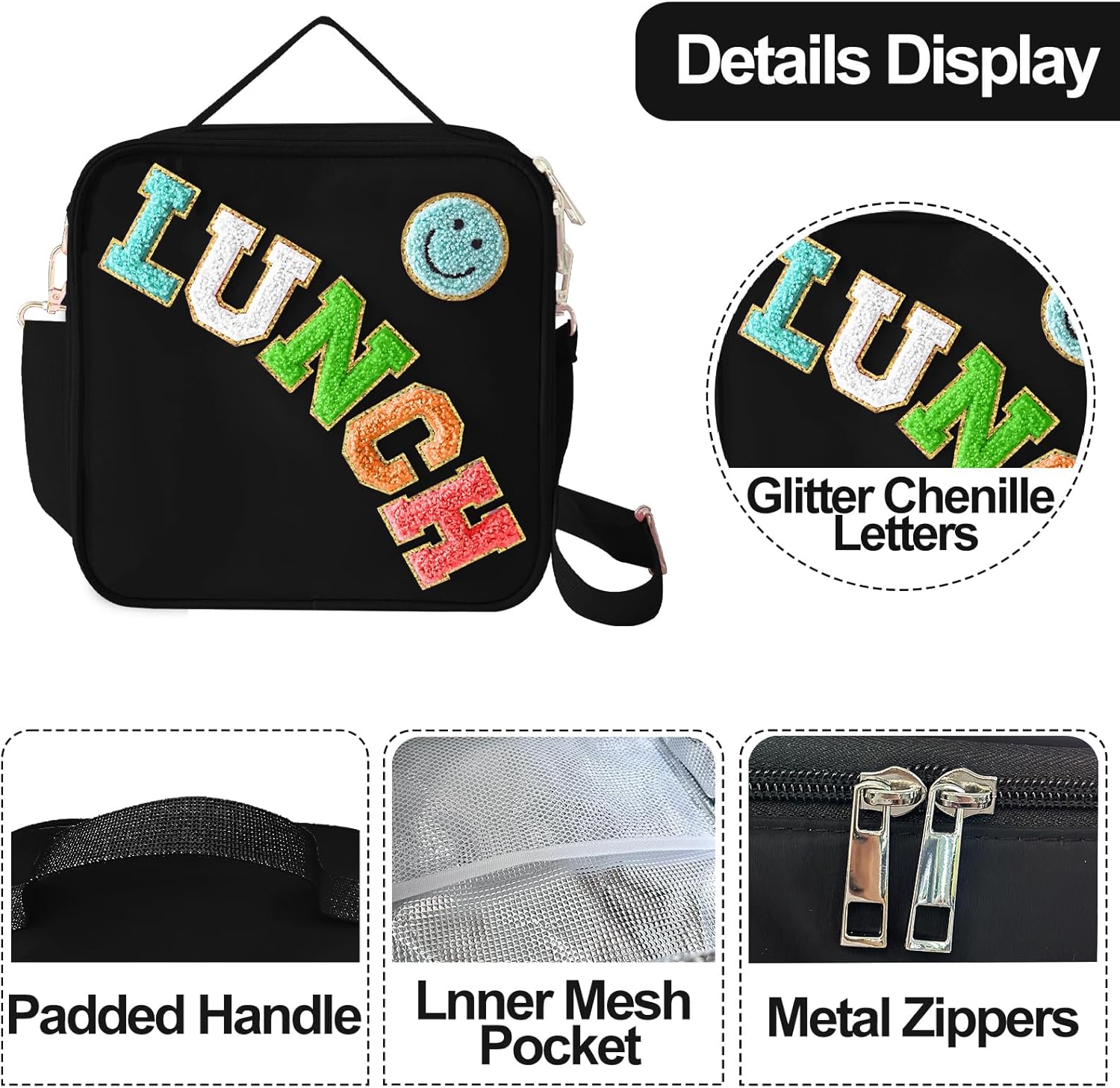 Insulated Lunch Bag With Adjustable Shoulder Strap, Nylon Preppy Lunch Box Large Insulated Lunch Bag Reusable Lunch Tote Bag with Smiley Preppy LunchBag for Girls School Travel Picnic (Black)