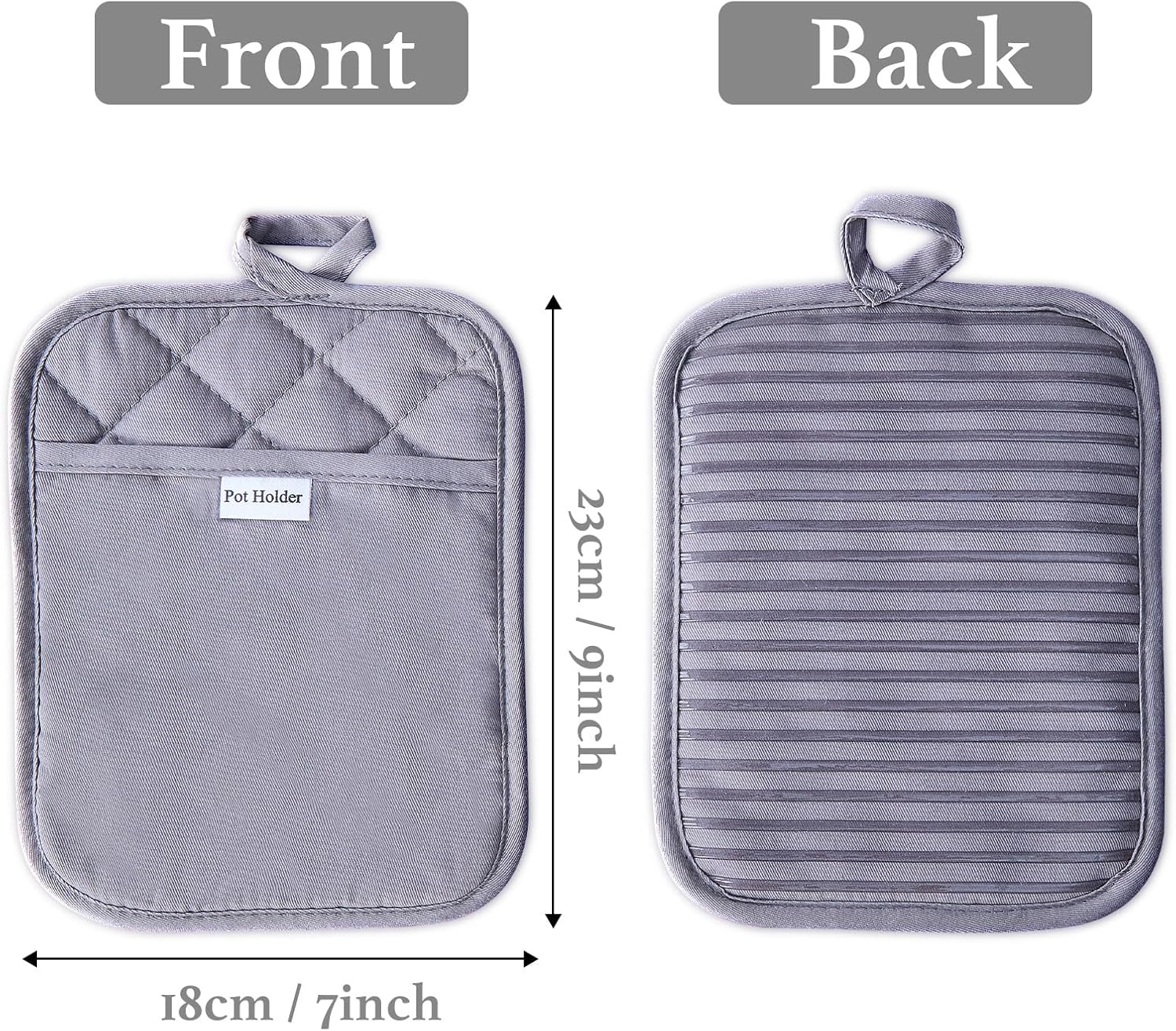 - The silicone is printed on one side of the pot holders, with a quilted backing. They are perfectly designed with a loop for easy hanging!