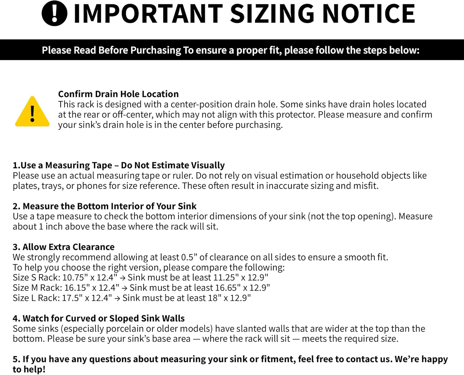 - ⚠️5. If you have any questions about measuring your sink or fitment, feel free to contact us. We’re happy to help!