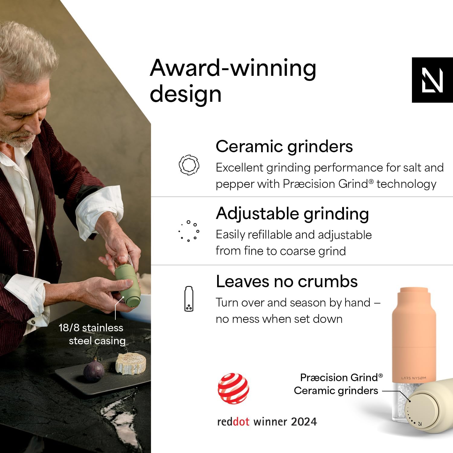 LARS NYSØM Salt and Pepper Grinder Set, Stainless Steel Manual Salt and Pepper Mills, Adjustable Ceramic Grinder, Design Spice Shakers (Peach/Beige)