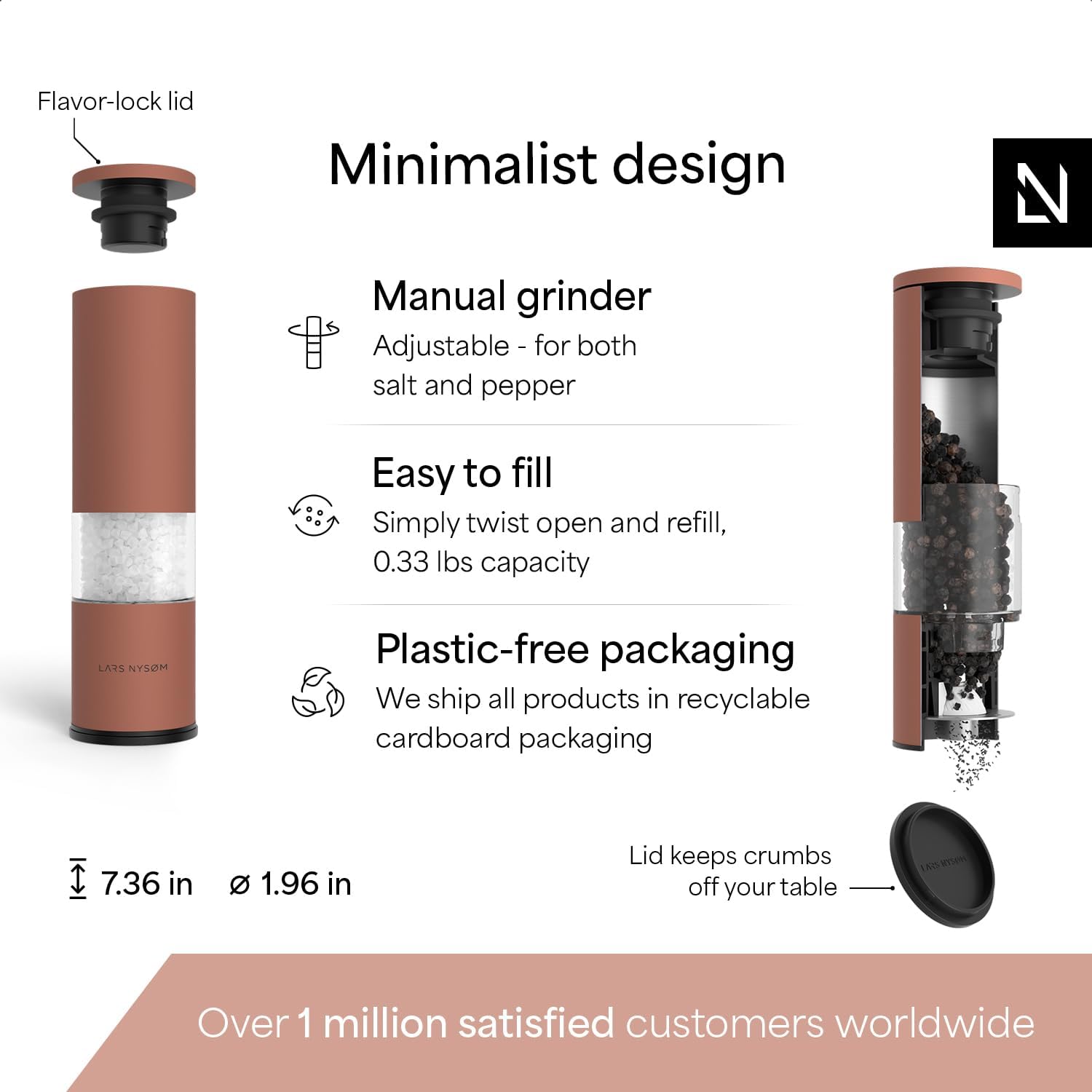 LARS NYSØM Salt and Pepper Grinder Set Manual, Stainless Steel Salt and Pepper Mills with Adjustable Ceramic Grinder I Design Spice Shakers (Brick Red)