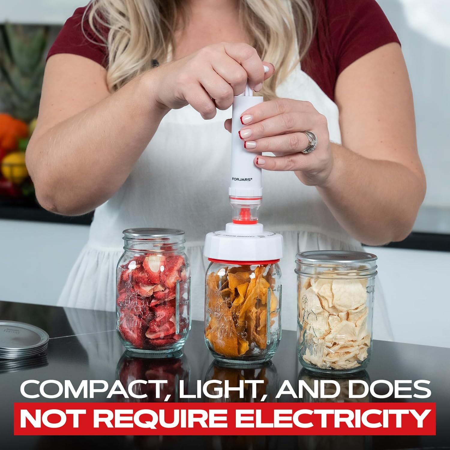 FORJARS Jar Vacuum Sealer Accessory Set for Mason Jars - Compatible with Regular and Wide Mouths, Cordless Pump for Portable Manual Hand Sealing, no electric. Vacuum Sealer with Plastic Lids