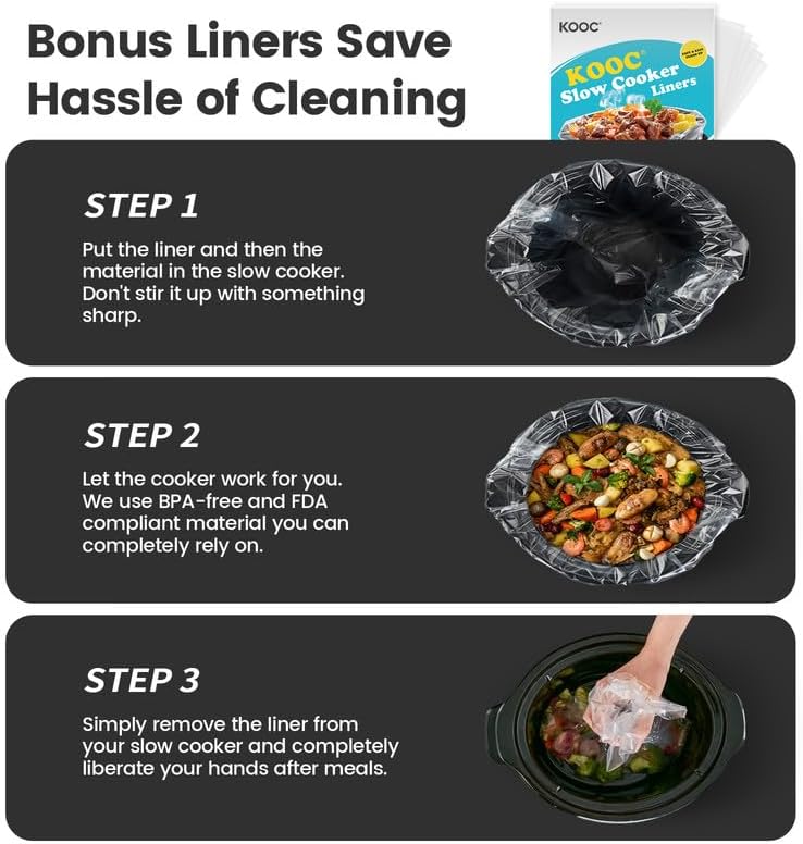 - [Additional Liners] Each KOOC slow cooker comes with 6 additional slow cooker liners that fit snugly inside the crocks for easy cleanup and maintenance
