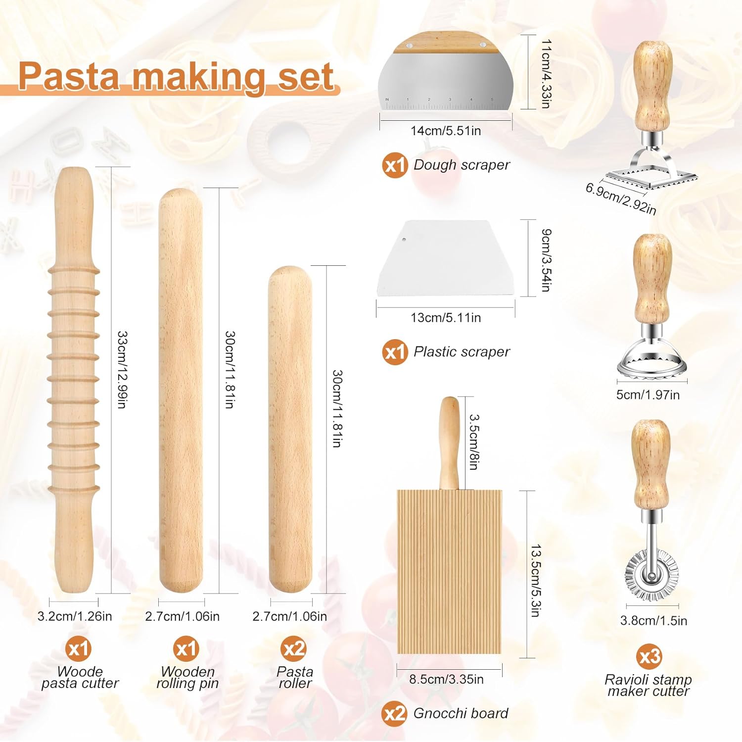 - Pasta Making Tools Set: This Pasta making accessories set includes 1 ravioli maker press, 1 potato ricer, 2 pasta roller, 1 wooden pasta cutter, 1 ravioli rolling pin, 1 gnocchi board, 1 wood stick, 2 dough scraper and 3 pasta stamps, These pasta making tools can meet your needs for making various kinds of pasta
