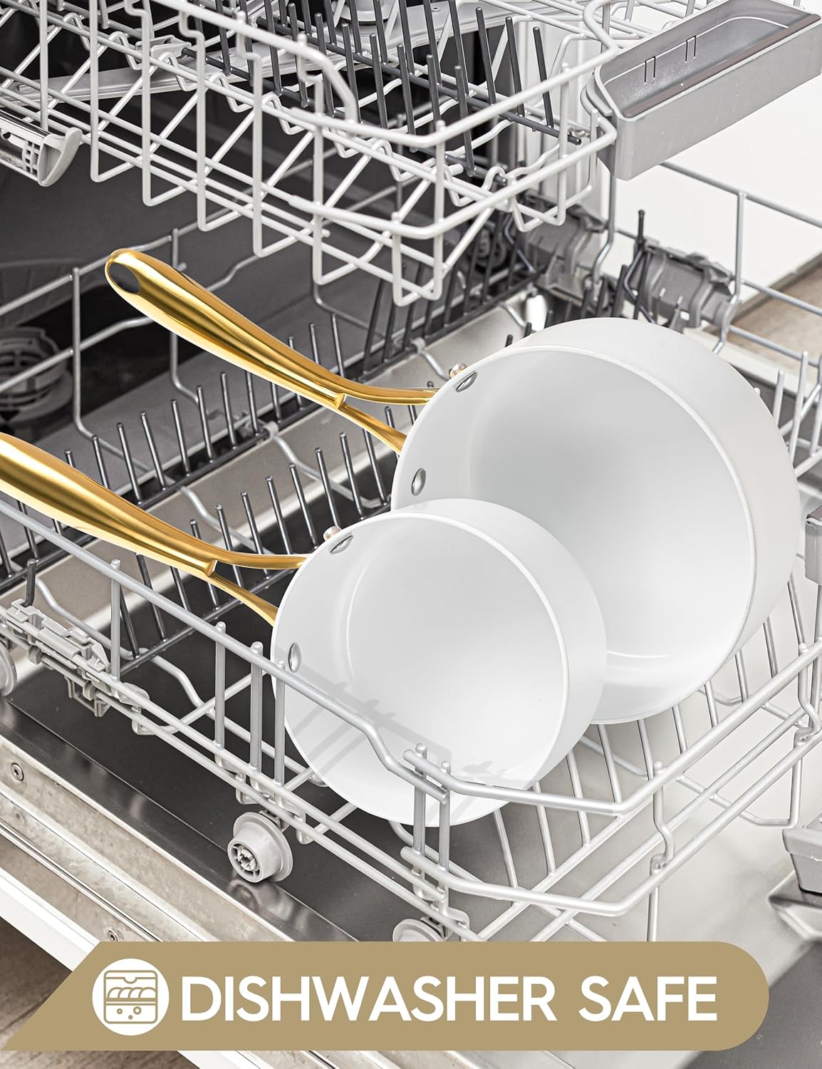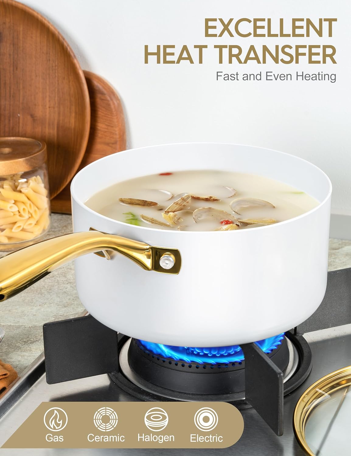 - Stunning Kitchen Artwork – Bring a touch of elegance to your kitchen with this sleek ceramic saucepan, complete with beautiful gold stainless steel handles.