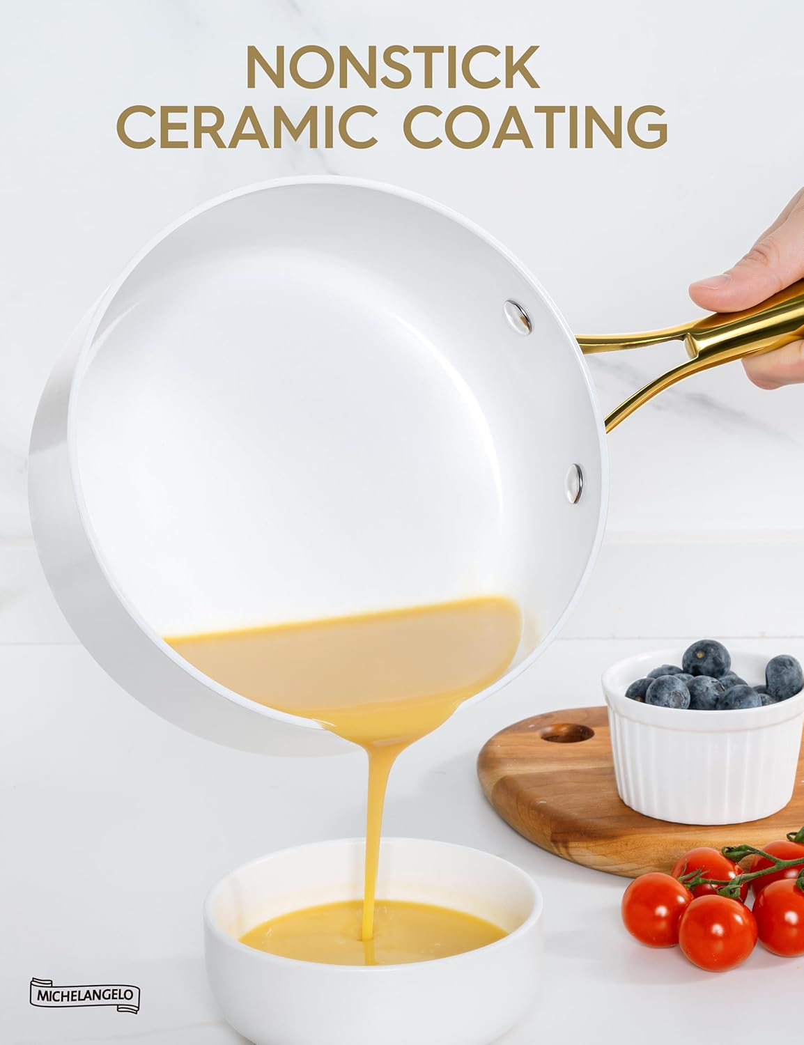 - Stunning Kitchen Artwork β Bring a touch of elegance to your kitchen with this sleek ceramic saucepan set, complete with beautiful gold stainless steel handles.