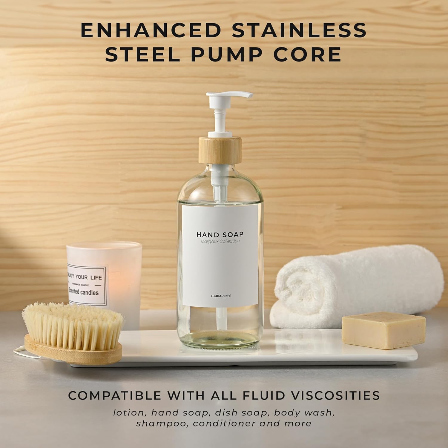 MaisoNovo Glass Hand Soap Dispenser | Dish Soap Dispenser for Kitchen | 16.9oz Clear Bottles with White Bamboo Pump | Bathroom Lotion Dispenser