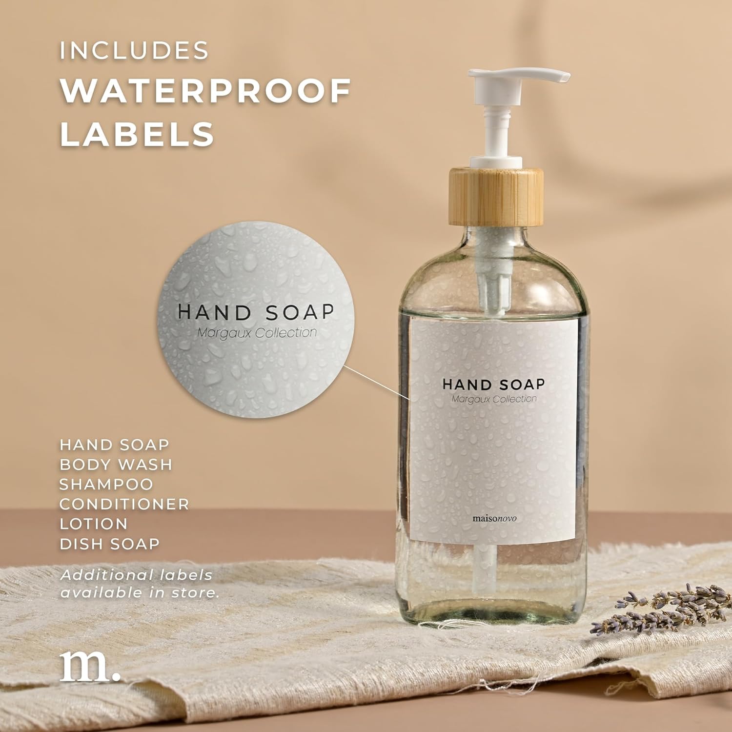 - This Pack Includes: A complete kitchen soap dispenser featuring a 16.9oz glass soap dispenser with pump bottles. Their elegant design is perfect for use as a hand soap dispenser for bathroom or kitchen, and comes with six durable, waterproof labels for organization: Hand Soap, Dish Soap, Body Wash, Lotion, Shampoo, and Conditioner.