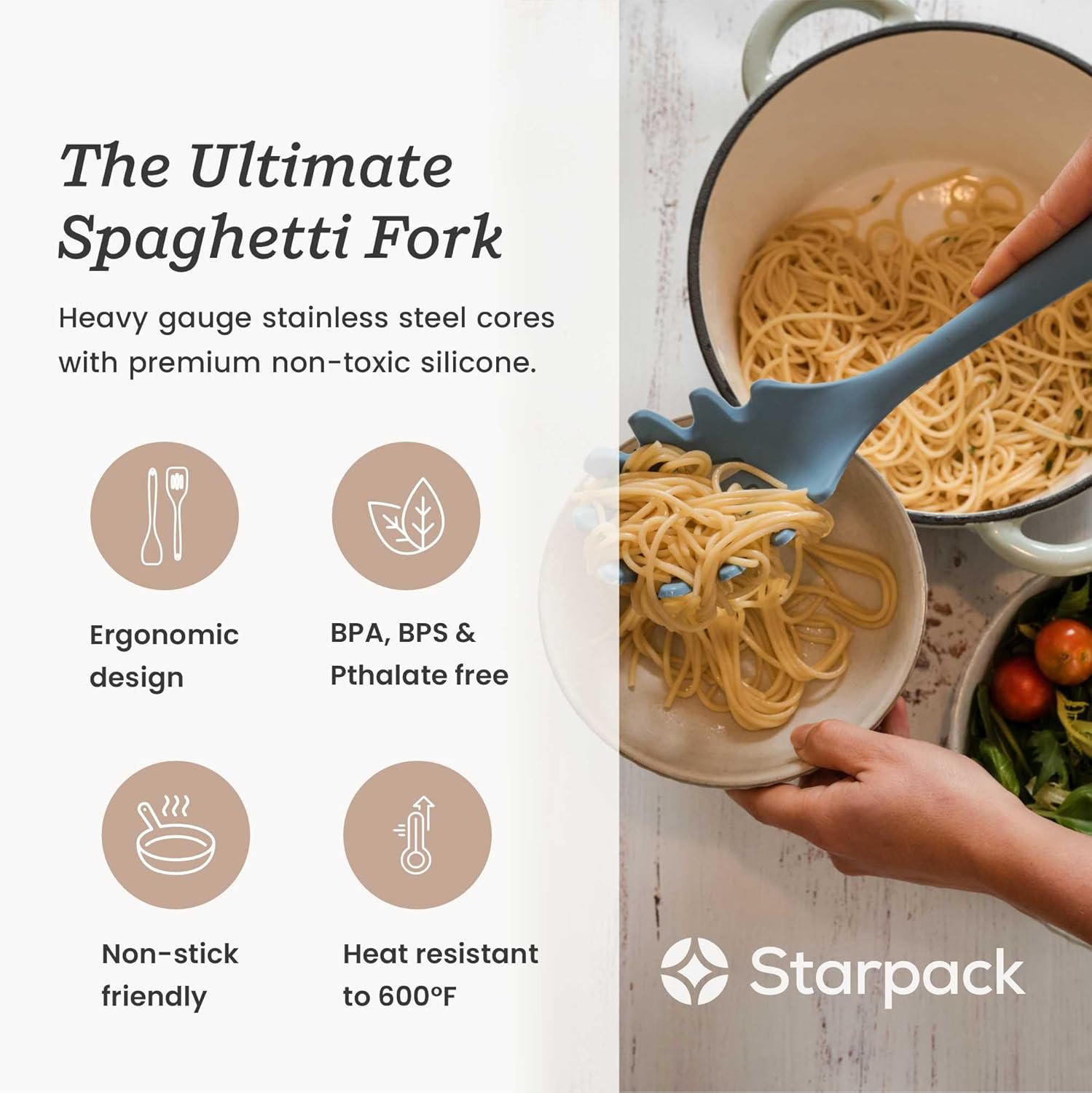 - Our XL sized hygienic one-piece pasta serving fork - it's forking good! Ergonomic design, high heat resistant to 600°F, non scratch and safe for all types of nonstick cookware including ceramic