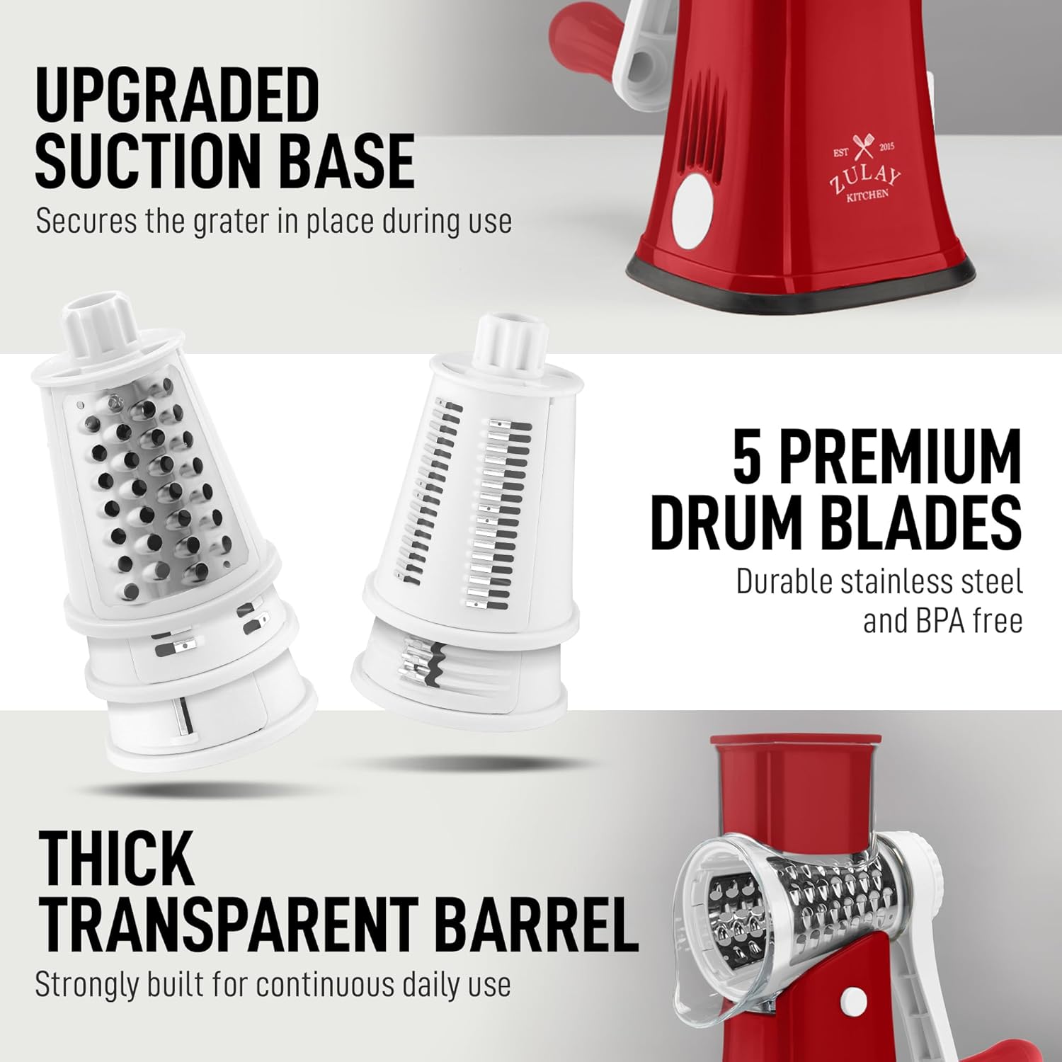 Zulay Kitchen Rotary Cheese Grater 5 Blade Cheese Shredder - Manual Hand Crank Cheese Grater With Reinforced Suction & 5 Interchangeable Drums - Easy to Use, Vegetable Chopper Round Mandoline Slicer