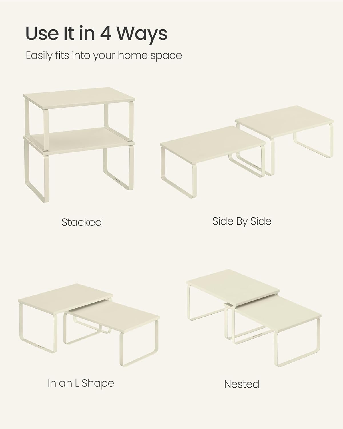 - [Adjustable] With their unique design, with one slightly smaller than the other, these shelf organizers can be stacked on top of one another, nested, used separately, or even in an L-shape. Adjust them how you want to perfectly fit your kitchen space