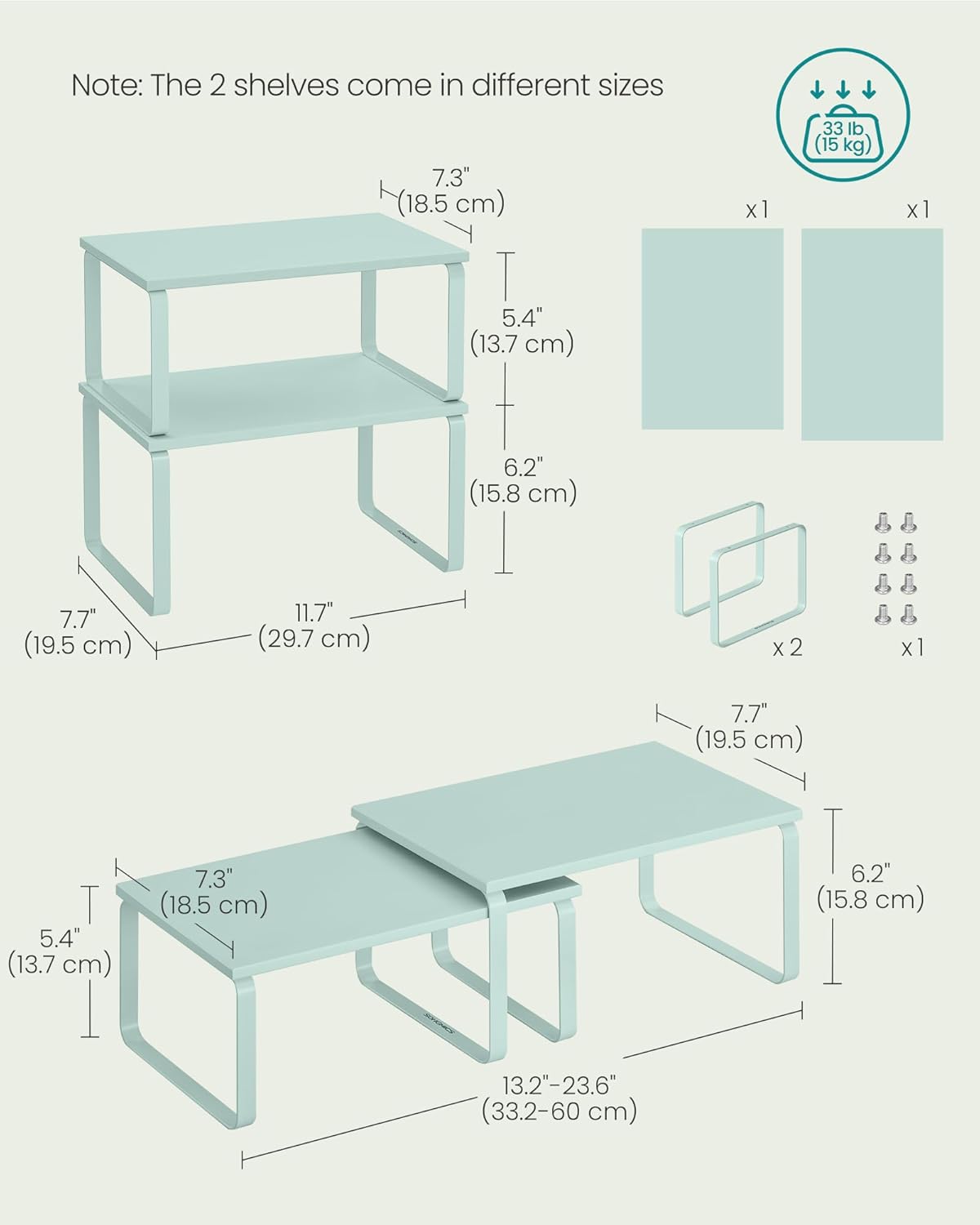 - [Adjustable] With their unique design, with one slightly smaller than the other, these shelf organizers can be stacked on top of one another, nested, used separately, or even in an L-shape. Adjust them how you want to perfectly fit your kitchen space