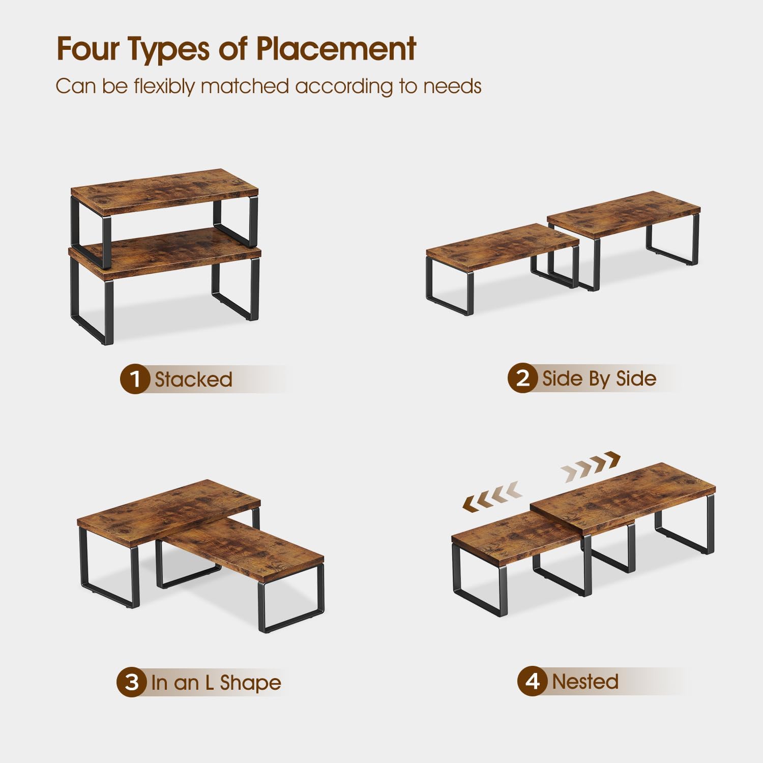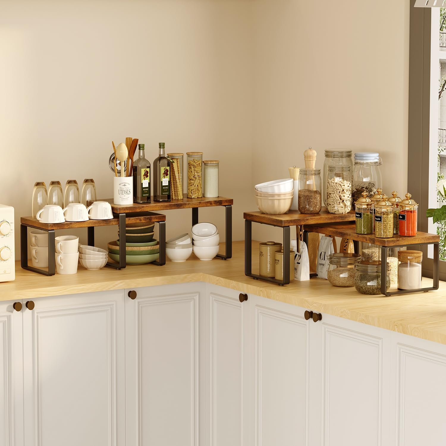 - ADJUSTABLE DESIGN: These kitchen cabinet organizers can be stacked, nested, used individually, or arranged in an L-shape for use. You can flexibly adjust the placement of these desk shelves according to your preference and space