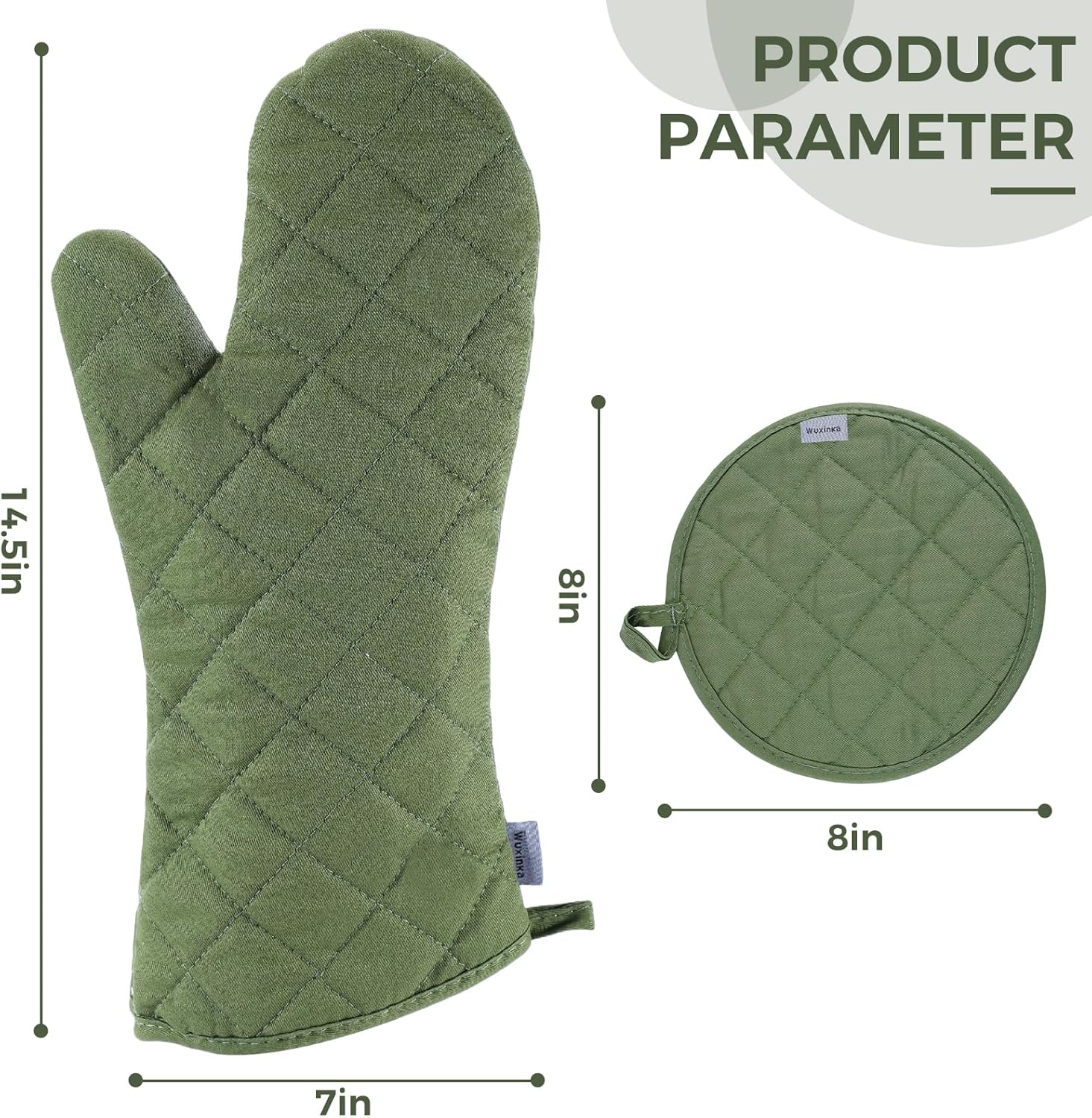 Set of 4 Oven Mitts and Pot Holder Heavy and Tall Kitchen Cotton Gloves Lined Towelcloth, Gloves Length 40cm, Pot Holder Width 20cm Diameter Round… (Army Green)