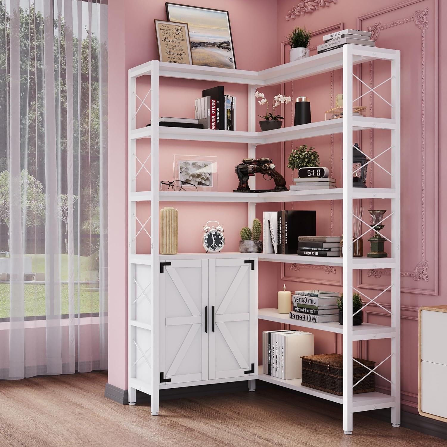 - ✅【With Double - Layer Lockers】 Our corner bookshelf's double - layer lockers are a storage powerhouse. They offer abundant space, ideal for stowing away books, documents, and personal items, helping you stay organized. The lockers' tight - fitting doors keep dust at bay, ensuring your belongings remain clean. This also provides excellent privacy, perfect for hiding valuables or sensitive items.
