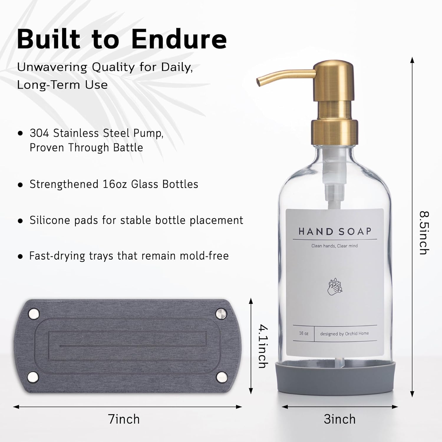 - LUXURY SOAP DISPENSER SET: Elevate the look and feel of your kitchen or bathroom with our luxurious kitchen soap dispenser set. This set includes two transparent glass bottles with sleek gold stainless steel pump heads, two gray silicone bottom anti-slip pads, a dish brush, a brush holder, and a quick-drying diatomaceous earth tray. Experience a modern and elegant upgrade with this stylish set for your daily soap needs