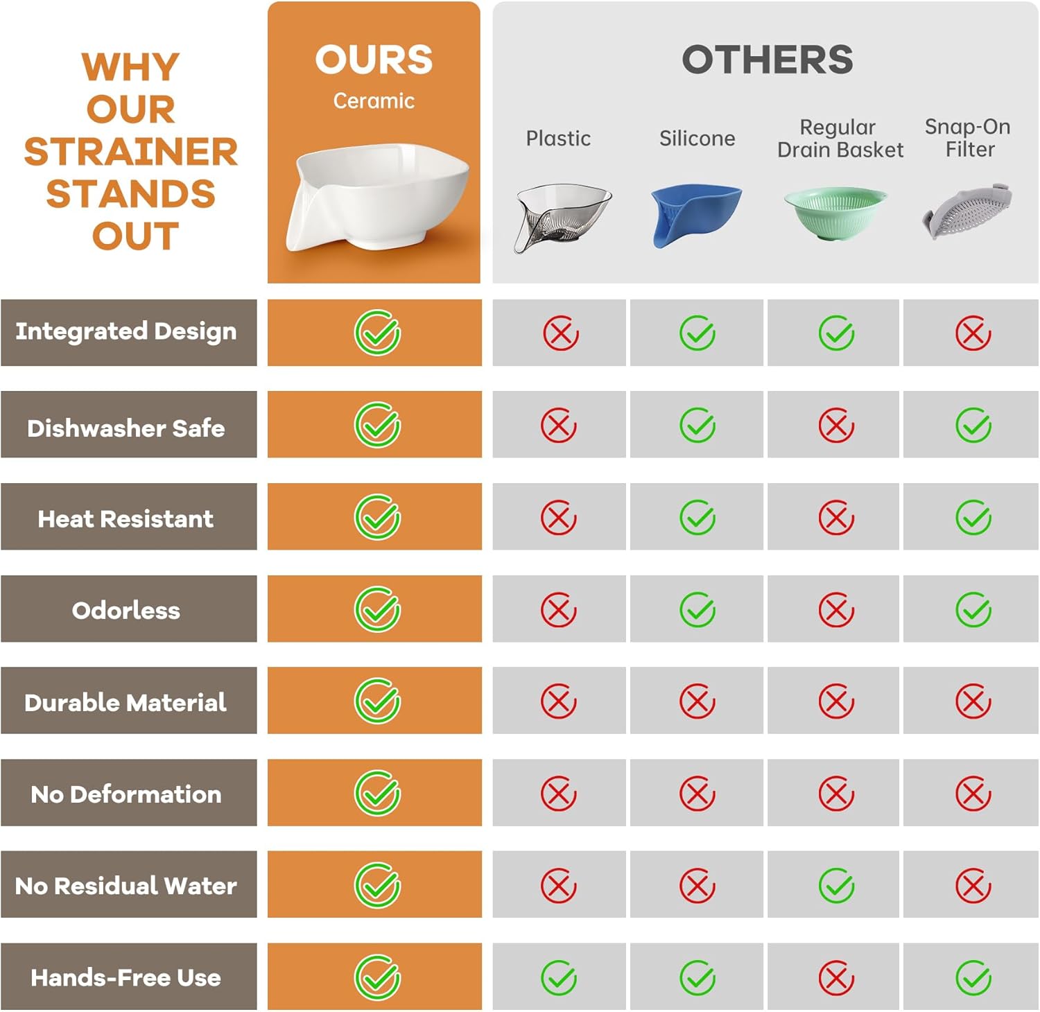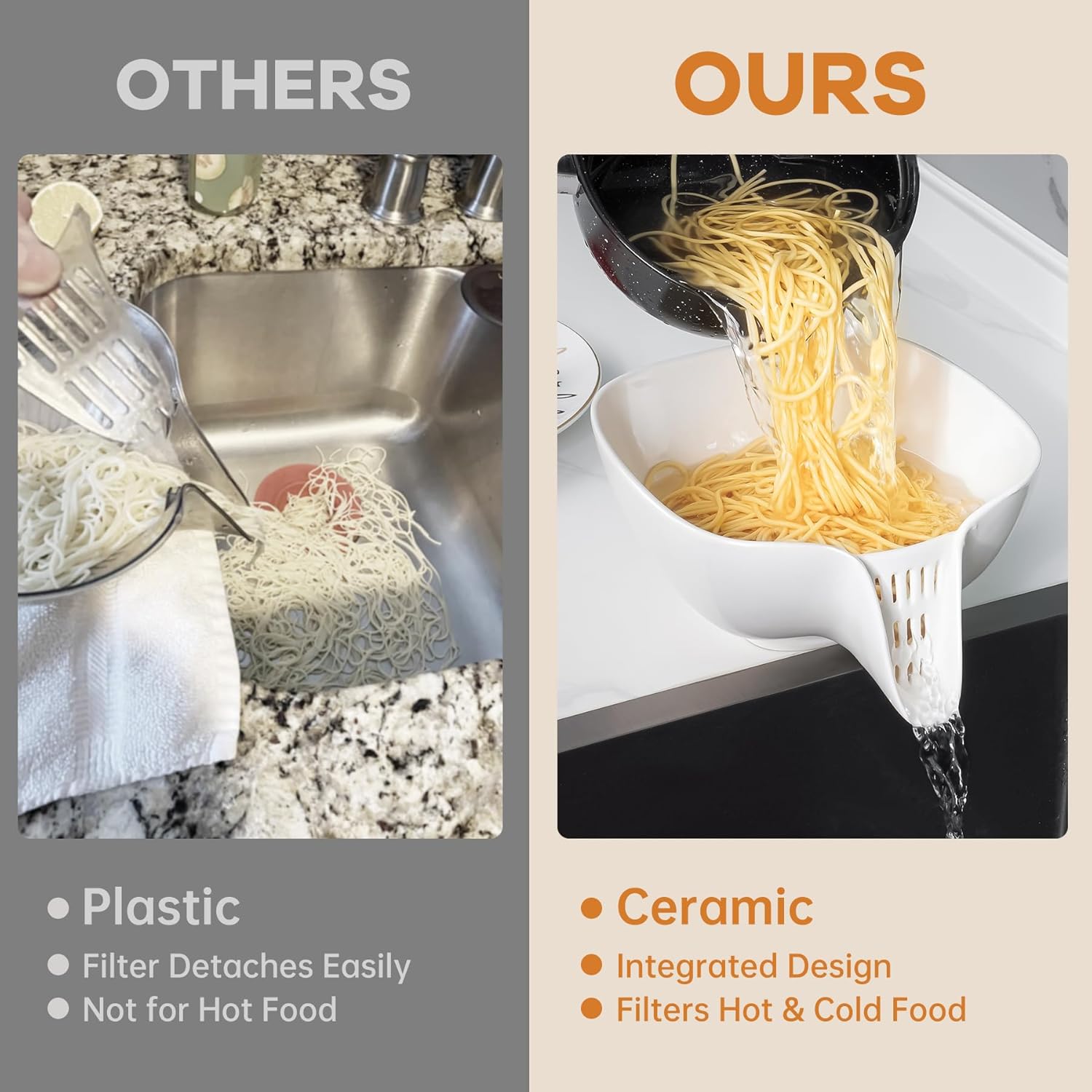 - Premium Ceramic Material: Made from high-quality ceramic, this product offers exceptional stability and slow heat transfer properties. It won’t crack under sudden temperature changes and remains safe to touch when draining hot food, ensuring safer use.