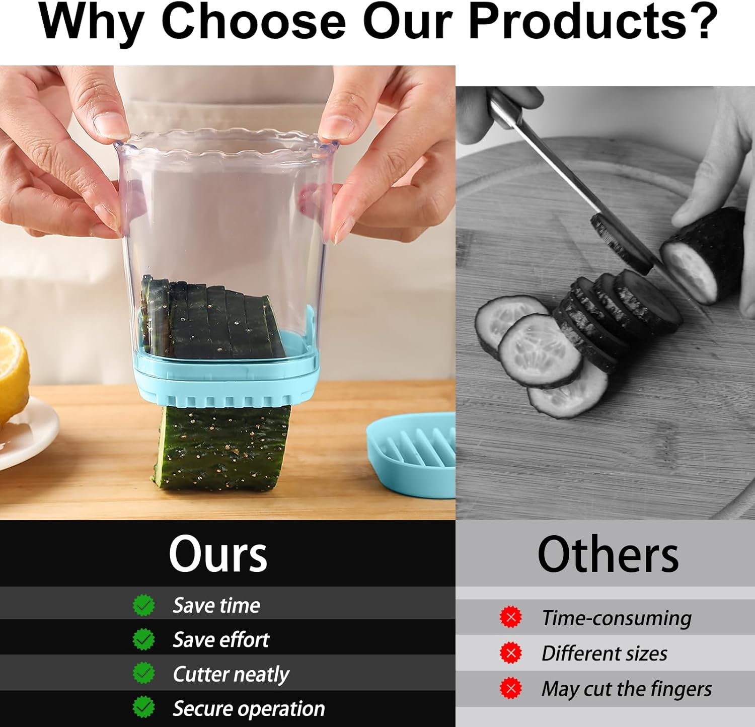 - Fruits Slicer: Fruit Slicers 8 times faster than a knife! Our fruit cutter makes prep a breeze. Easily cut 18 strawberries in 9 seconds, saving you time and energy. With this fruit chopper you can easily slice fruits and vegetables into more uniform shapes, save your time and make slicing fruits a breeze.