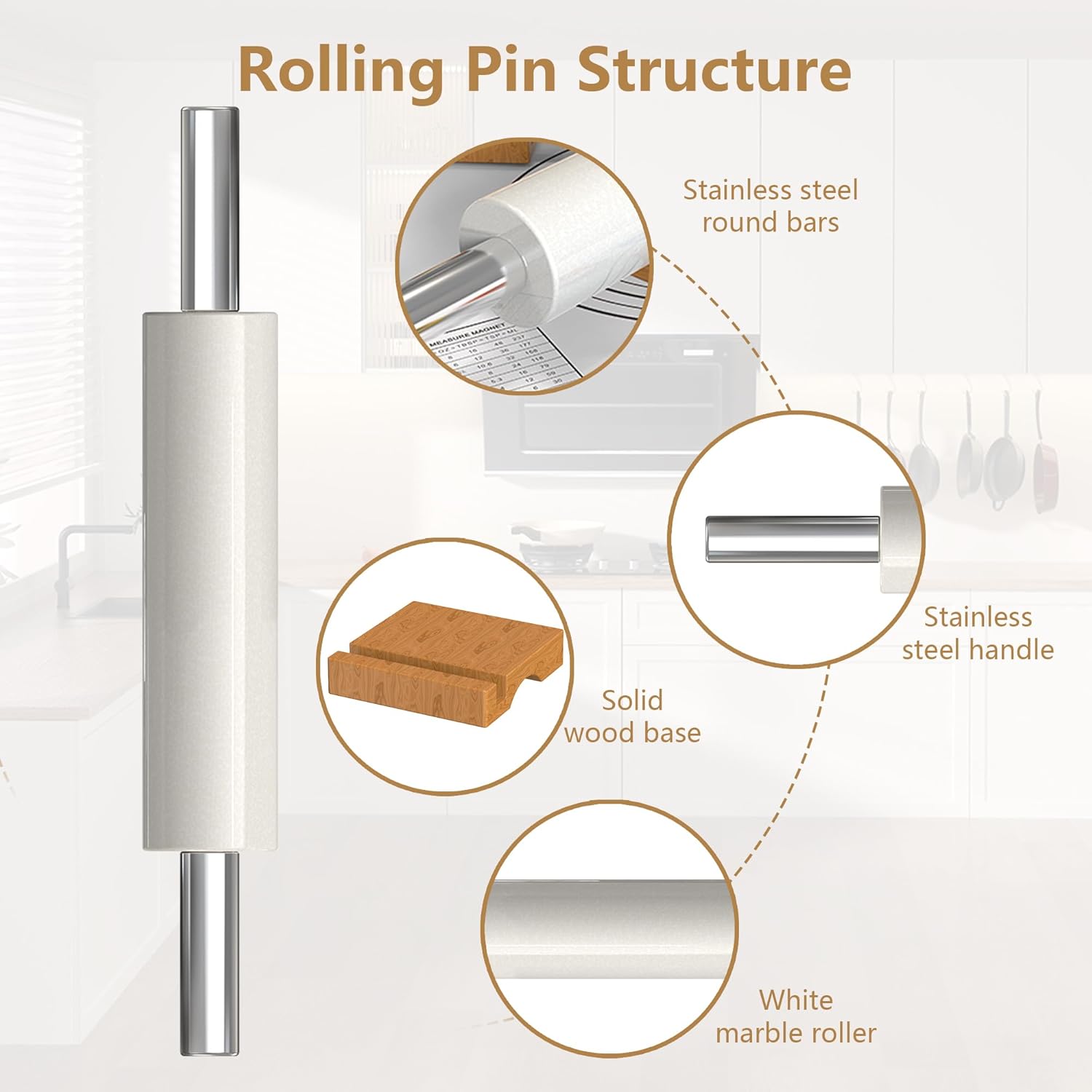 Marble Rolling Pin with Stainless Steel Handle for Baking,Fondant,Pizza,Cookie Crust,Pie,Cookies,Pastry, 18.5â(Includes handle) Marble Rolling Pin with 3 Multi-Color Thicknesses and Wood Stand