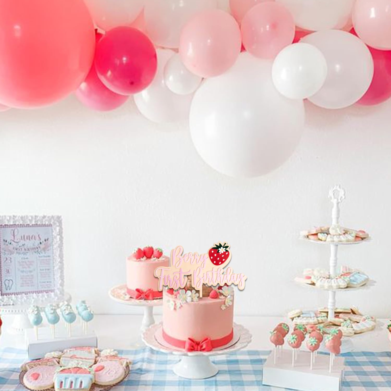 - Adorable Strawberry Design - This cake topper features charming strawberry and letter patterns that add a delightful touch to any first birthday cake, creating a cute and festive atmosphere. This cake topper sizes is 7.5 in * 5 in that is suitable for 4-8 inch cakes. Ideal size for most size cakes.