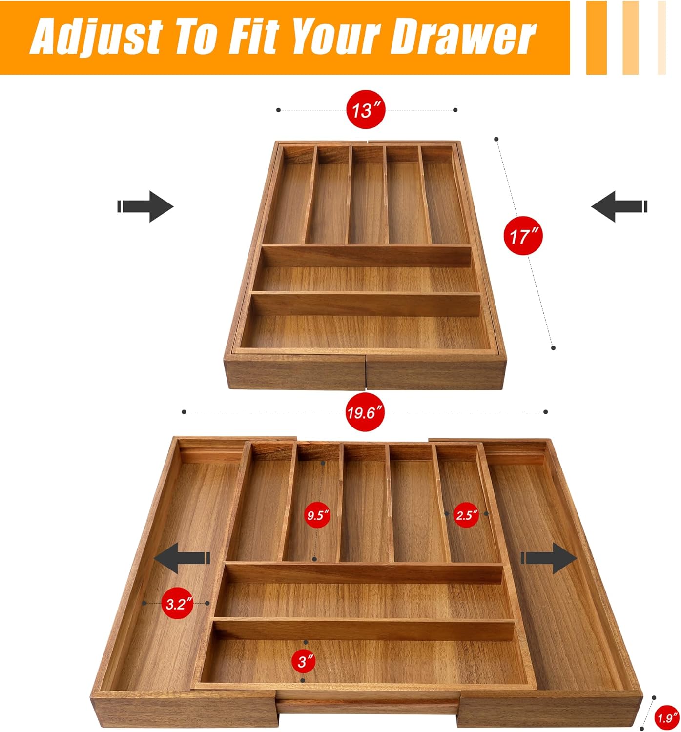 - ✅【Expandable - fit most kitchen drawers.】Our large utensil silverware drawer organizer flatware cutlery tray are adjustable in width, expanding from 17"x13" to 17"x19.6" as needed, with a depth of 1.9" . The utensil silverware drawer organizer is crafted from natural bamboo that has been grown for over 4 years. Each silverware drawer organizer made of bamboo is meticulously handcrafted by seasoned artisans to ensure a smooth, splinter-free surface. You can confidently allow your family or children to use our silverware drawer organizer.