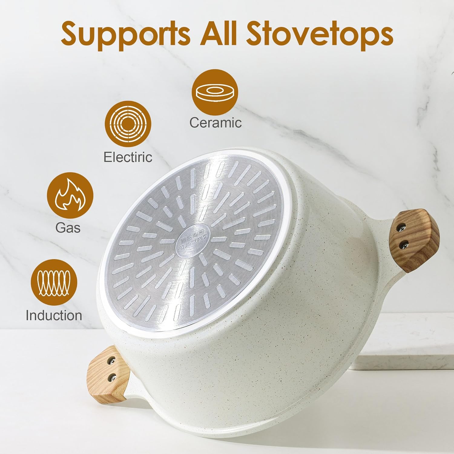 - INDUCTION COMPATIBLE - The nonstick dutch oven is constructed from cast aluminum with stainless steel base to prevent from warping, wobbling, or degrading over time, heats fast and evenly. Suitable for all stovetops, including Induction cooktop