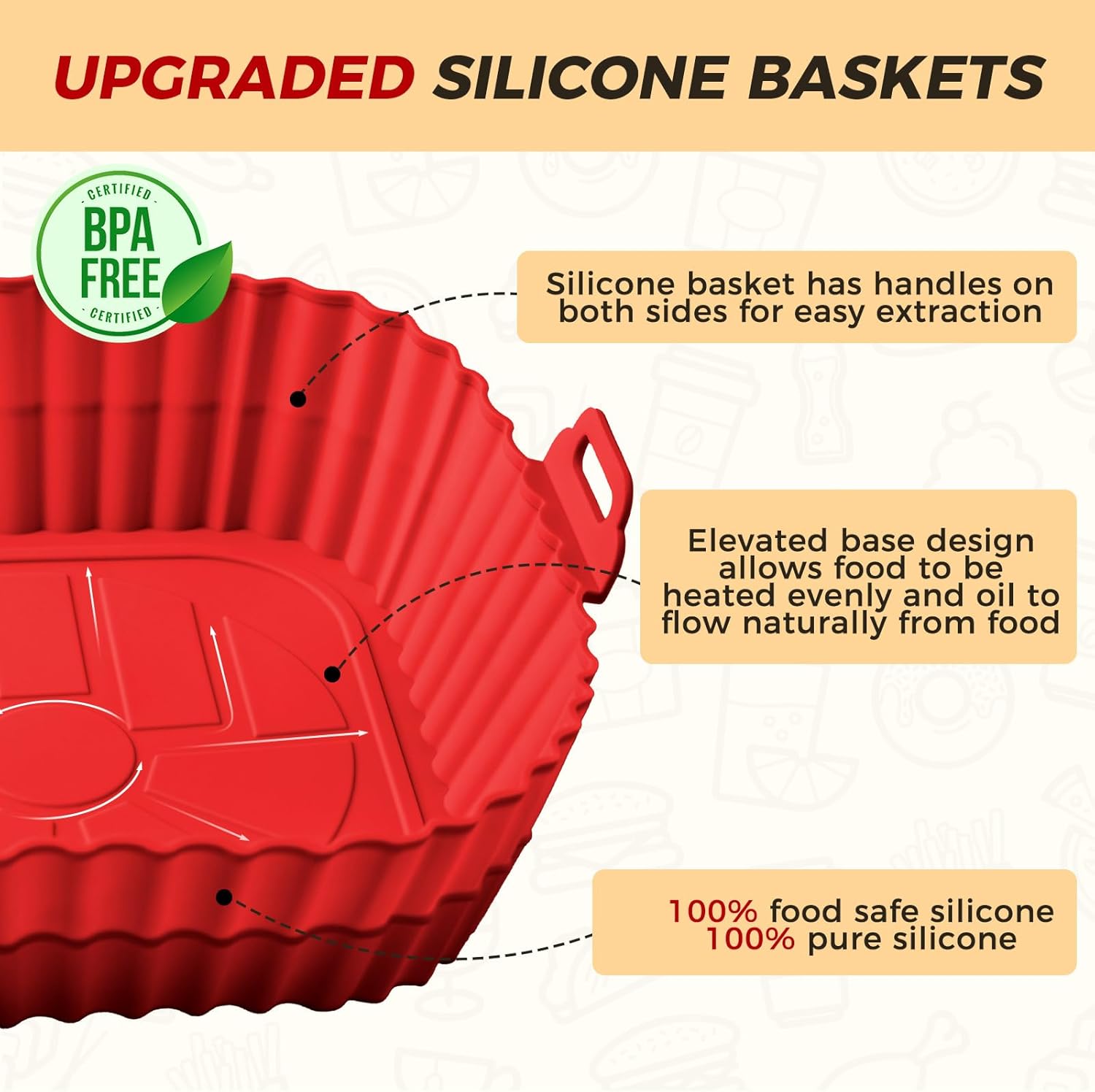 - 🍟【Practical Design】- The reusable air fryer silicone pot have many raised lines, which improve the circulation of heat to fully heat the food for a more even doneness. Keep your bacon, breads, pizza, turkey, fries, buns integrity and nice look, and no effect on the taste of the food. Our silicone air fryer pot are designed with intimate handles on both sides to protect your hands from burns when removing the silicone pot. They are great kitchen air fryer accessories.