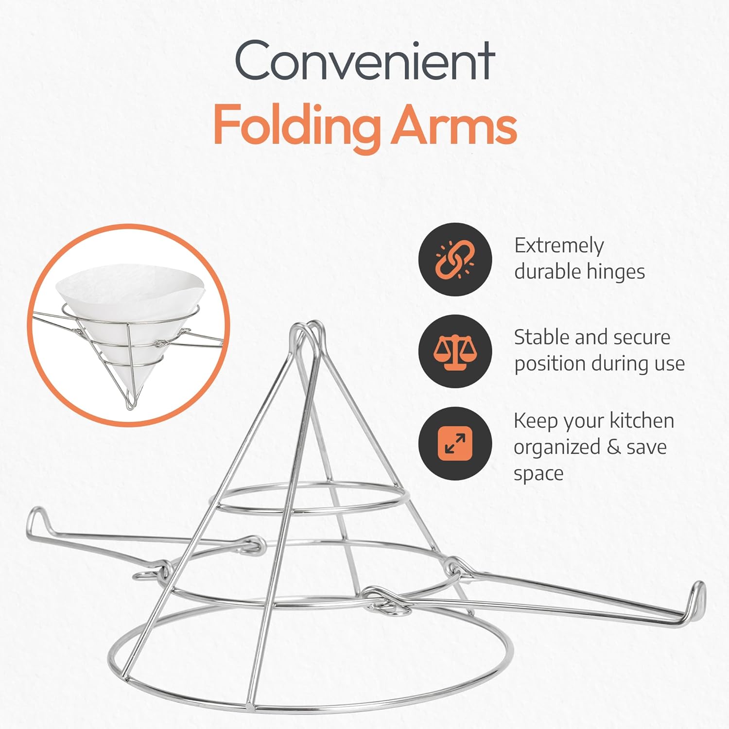 - FOLDING ARMS - Our Cuisine Ready Oil Cone Filter Holder features ingenious folding arms that ensure a stable position and make the oil filtering process hassle-free, while keeping your kitchen organized and saving space by allowing a compact storage. Our Fryer Filter Stand is also perfect for maple syrup and sap filter holder. Say goodbye to clutter and hello to efficiency, this stand is an essential element for your maple syrup cone filters, fry oil filters, and more.