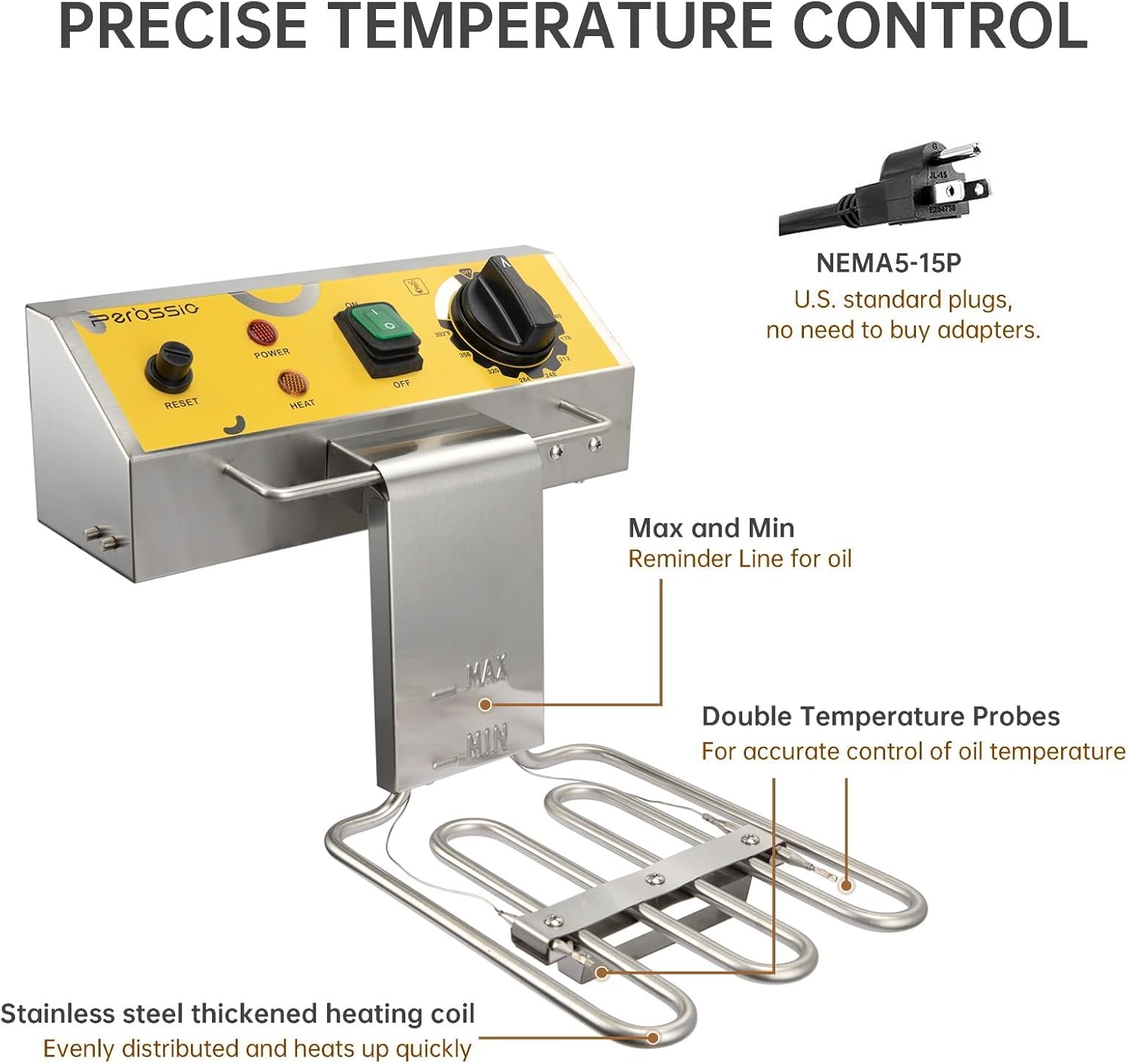- Powerful and Auto Heating - 1750 w heating element allows large fryers with baskets to serve crispy food in a short time.When you lift up the electric control box, the thermal tubes will be out of the oil automatically. Then the reset button will take action to cut off the power