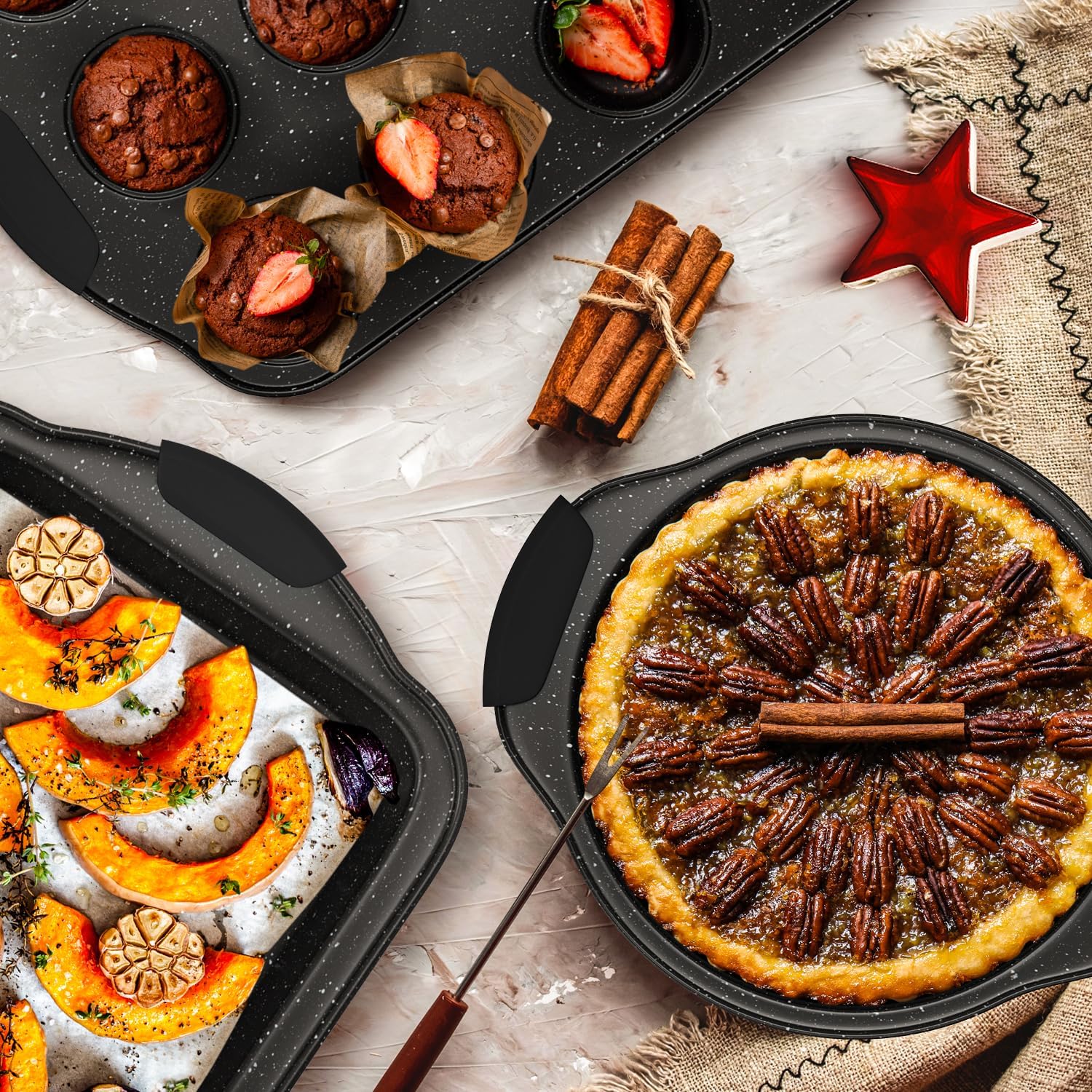 11-Piece Nonstick Baking Pan Set, Stackable Bakeware Sets, Oven Pans for Baking with Silicone Handles, Includes Cookie Sheet, Cake Pans, Loaf Pan, Pizza Pan, Muffin Pan, Black