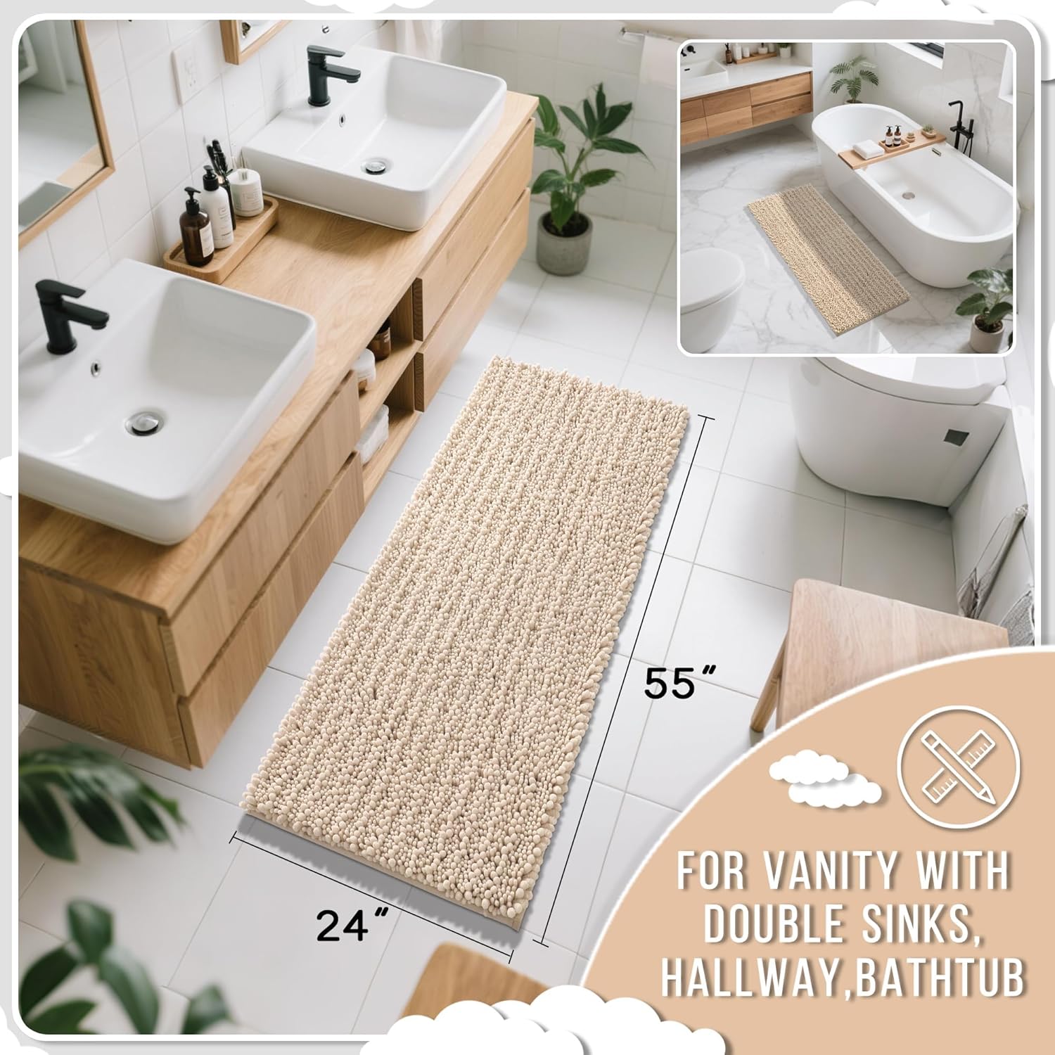 Yimobra Bathroom Runner Rug 55x24 Inch - Extra Long Non Slip Chenille Bath Mat, Soft & Absorbent, Machine Washable Shaggy Hallway Carpet for Vanity Tub Shower, Light Brown Home Decor Accessories